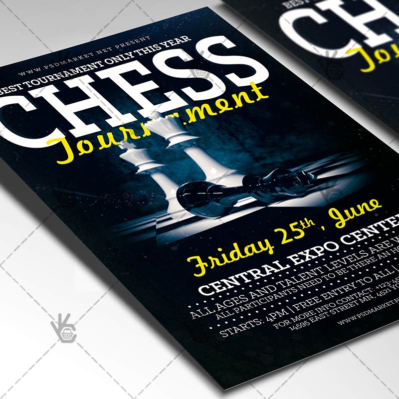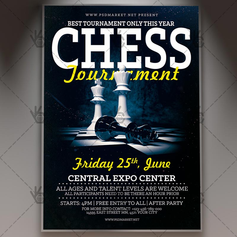 Chess Tournament Flyer is a simply modern flyer design by PSDmarket Team to be used with Photoshop CS3 and higher. Save your time and use it for business or for your clients! This can be use for Chess Tournament, Chess Game, Chess Club, Chess Match, Chess Challenge, Chess Camp or Chess Event and others.