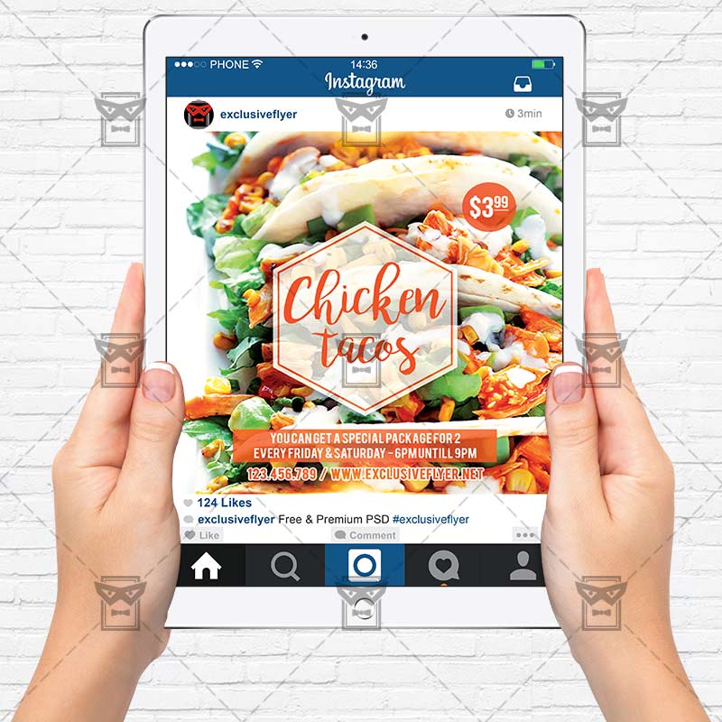 The Chicken Tacos is the exclusive Photoshop PSD flyer template designed by ExclusiveFlyer to promote your Chicken Tacos. This is a modern, stylish flyer and just be used for a Tacos Festival, Chicken Tacos Day, Chicken Tacos Promotion etc. Dear customers! – you can also: Customize any flyers or Hire Us to create any unique product. Also, you can get unlimited access to all our templates. You can buy 1 month membership, 3 or 6 months membership or even 1 year membership plan and login on site, choose a design, click the button DOWNLOAD TEMPLATE and it’s yours. No hassle, no checkout! When you paid the template, you can find it in your personal account and of course you’ve got a message to your e-mail (maybe in spam) with link to download. Also, you can find all templates, which you buy, in your personal account! All of our flyers have a very good quality (300DPI). And it means that you just need to download one of them and make the necessary modifications such as replace the elements or choose the colors and start to invite your guests! You can order from us design of Banner Ad, Bi-Fold Brochure, Tri-Fold Brochure, Business Card, Logo, One-Sided Flyer, Two-sided Flyer or Postcard. All you need is to checkout and write us all information on our e-mail or skype. (order now). There are a lot of free flyer templates, free business card templates on our site! Also there are a lot of categories of flyers such as club flyers, seasonal flyers, sport flyers and also business flyers. You have a great choise on our site, so good luck! Don’t forget to follow our Facebook community, our page on Twitter, on Pinterest and on Tumblr and leave comments, cause we work for you! PSD is set up in 1275×1875 dimension (4” x 6” with 0,25” bleed). The PSD file is very well organised, with color coded groups and layers named appropriately. Remember, all stock images of models and other people used only for demonstration all charms of the flyer and don’t included in the download!