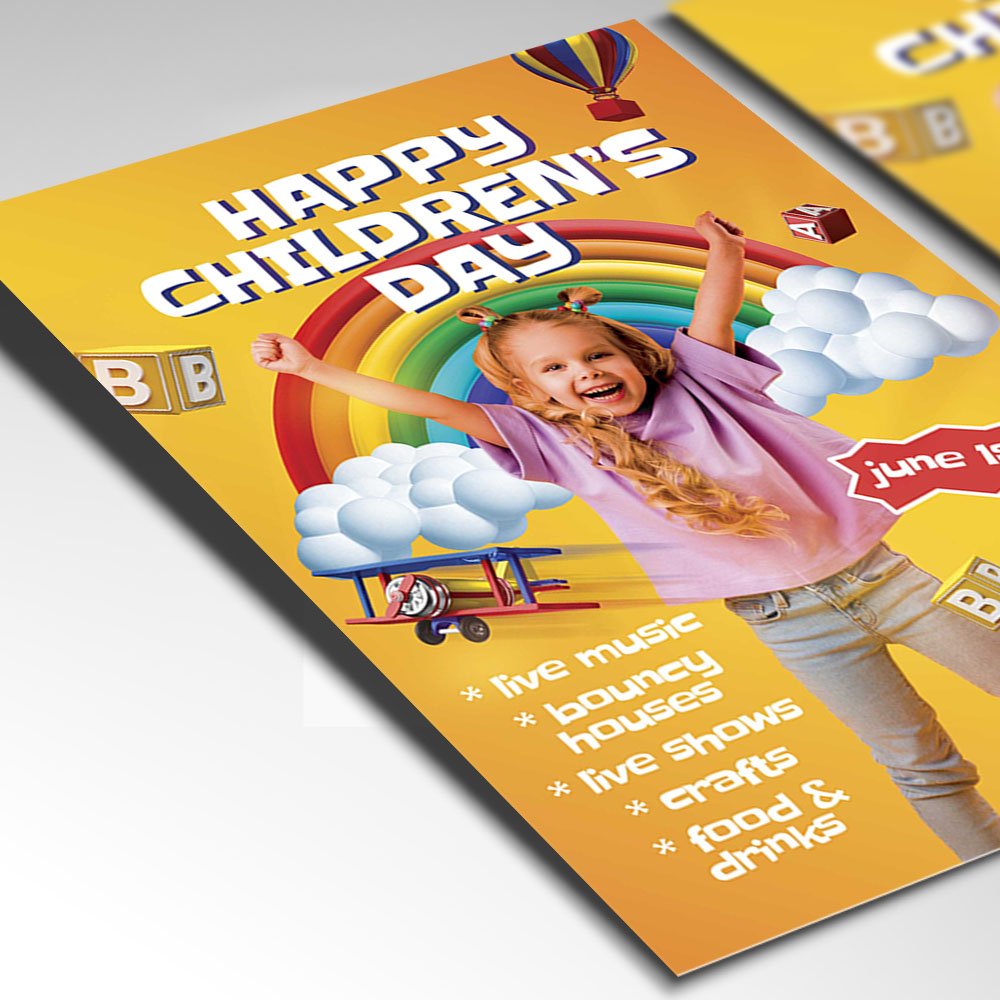 Children’s Day Flyer PSD TemplateSpark imagination and joy with our Children’s Day Flyer PSD Template. In 2026, events for the younger generation are evolving to be more interactive and inclusive than ever. Whether you are hosting a local community fair, a school festival, or a specialized play workshop, this template provides a vibrant, whimsical, and professional aesthetic that instantly captures the hearts of both kids and parents. Featuring playful hand-drawn elements, soft gradients, and cheerful character illustrations, it’s designed to be the perfect invitation to a world of fun. The Children’s Day Flyer PSD Template is built for busy event organizers who need high-quality results without the hassle. This Photoshop file is meticulously organized with labeled layers and smart objects, allowing you to customize everything from the 2026 event date to the list of activities—like face painting, VR zones, or eco-friendly craft workshops. With a high-resolution 300 DPI output, your flyers will look crisp as large-scale posters or high-gloss invitations, ensuring your branding remains top-tier across all physical and digital platforms. In the digital landscape of 2026, catching a parent’s eye during their daily scroll is a challenge. This template is optimized for high-impact social media marketing, making it easy to crop for Instagram, Pinterest, or school newsletter banners. By choosing this Children’s Day Flyer PSD Template, you are presenting an organized and trustworthy image that gives parents the confidence to bring their families to your event. Download it today and let the childhood magic begin! — Features of the Children’s Day Flyer PSD Template