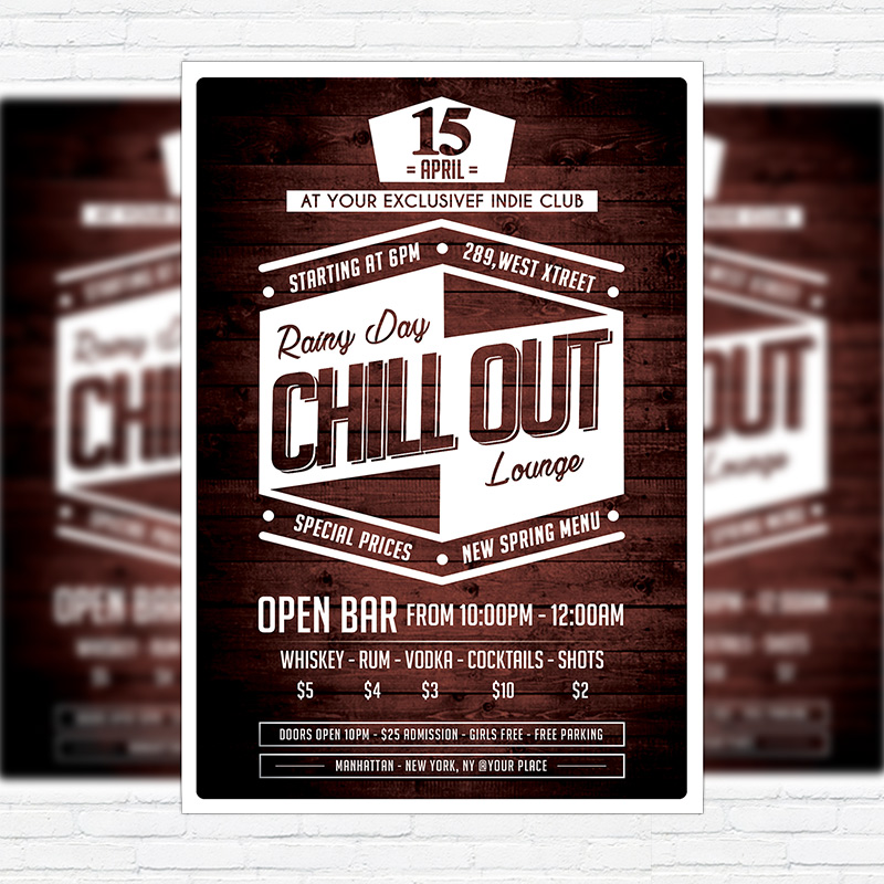 The Chill Out is the exclusive Photoshop PSD flyer template designed by ExclusiveFlyer to promote your Chill Out Party. This is a modern, stylish flyer and just be used for a Chill Out Night or Indie Night etc. Dear customers! – you can also: Customize any flyers or Hire Us to create any unique product. Also, you can get unlimited access to all our templates. You can buy 1 month membership, 3 or 6 months membership or even 1 year membership plan and login on site, choose a design, click the button DOWNLOAD TEMPLATE and it’s yours. No hassle, no checkout! When you paid the template, you can find it in your personal account and of course you’ve got a message to your e-mail (maybe in spam) with link to download. Also, you can find all templates, which you buy, in your personal account! All of our flyers have a very good quality (300DPI). And it means that you just need to download one of them and make the necessary modifications such as replace the elements or choose the colors and start to invite your guests! You can order from us design of Banner Ad, Bi-Fold Brochure, Tri-Fold Brochure, Business Card, Logo, One-Sided Flyer, Two-sided Flyer or Postcard. All you need is to checkout and write us all information on our e-mail or skype. (order now). There are a lot of free flyer templates, free business card templates on our site! Also there are a lot of categories of flyers such as club flyers, seasonal flyers, sport flyers and also business flyers. You have a great choise on our site, so good luck! Don’t forget to follow our Facebook community, our page on Twitter, on Pinterest and on Tumblr and leave comments, cause we work for you! PSD is set up in 1275×1875 dimension (4” x 6” with 0,25” bleed). The PSD file is very well organised, with color coded groups and layers named appropriately. Remember, all stock images of models and other people used only for demonstration all charms of the flyer and don’t included in the download!