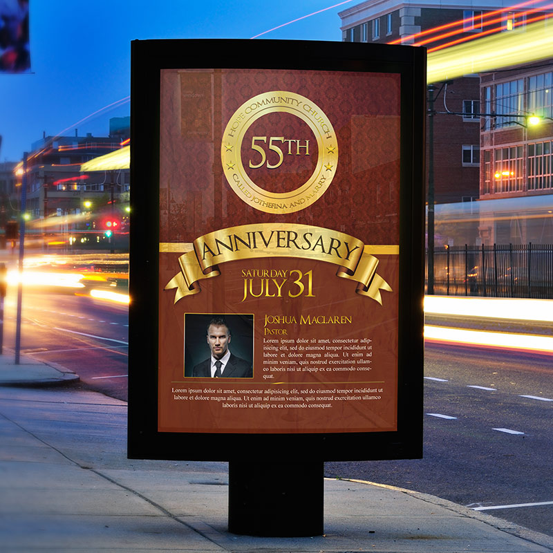 The Church Anniversary is the exclusive Photoshop PSD flyer template designed by ExclusiveFlyer to promote your Church Anniversary. This is a modern, stylish flyer and just be used for a Church Anniversary or Gospel, etc. Dear customers! – you can also: Customize any flyers or Hire Us to create any unique product. Also, you can get unlimited access to all our templates. You can buy 1 month membership, 3 or 6 months membership or even 1 year membership plan and login on site, choose a design, click the button DOWNLOAD TEMPLATE and it’s yours. No hassle, no checkout! When you paid the template, you can find it in your personal account and of course you’ve got a message to your e-mail (maybe in spam) with link to download. Also, you can find all templates, which you buy, in your personal account! All of our flyers have a very good quality (300DPI). And it means that you just need to download one of them and make the necessary modifications such as replace the elements or choose the colors and start to invite your guests! You can order from us design of Banner Ad, Bi-Fold Brochure, Tri-Fold Brochure, Business Card, Logo, One-Sided Flyer, Two-sided Flyer or Postcard. All you need is to checkout and write us all information on our e-mail or skype. (order now). There are a lot of free flyer templates, free business card templates on our site! Also there are a lot of categories of flyers such as club flyers, seasonal flyers, sport flyers and also business flyers. You have a great choise on our site, so good luck! Don’t forget to follow our Facebook community, our page on Twitter, on Pinterest and on Tumblr and leave comments, cause we work for you! PSD is set up in 1275×1875 dimension (4″×6″ with 0,25″ bleed). The PSD file is very well organised, with color coded groups and layers named appropriately. Remember, all stock images of models and other people used only for demonstration all charms of the flyer and don’t included in the download!