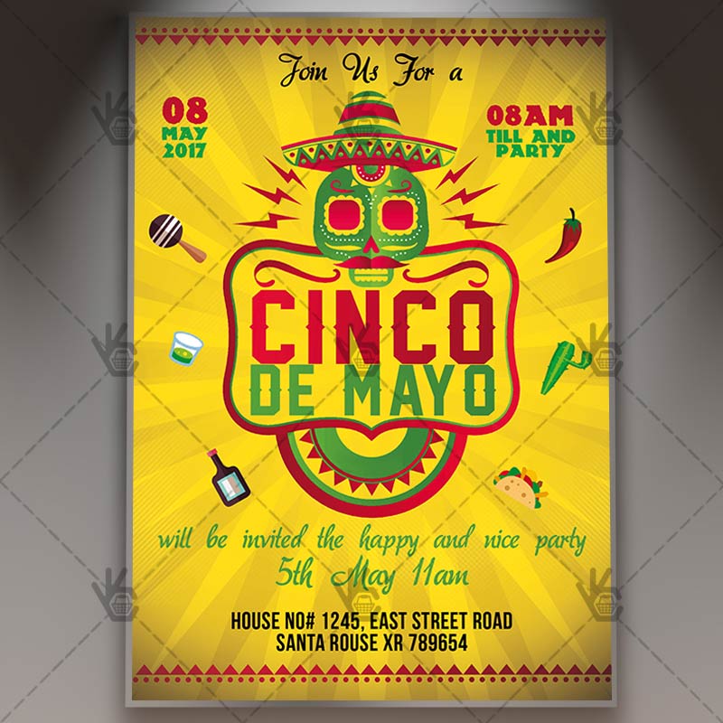 Cinco de Mayo Celebration is a simply modern flyer design by PSDmarket Team to be used with Photoshop CS3 and higher. Save your time and use it for business or for your clients! This can be use for Cinco De Mayo Night, Cinco De Mayo Carnival, 2017 Cinco De Mayo, Cinco De Mayo Party, Cinco De Mayo Fiesta, Cinco De Mayo Day or Cinco De Mayo Event and others.