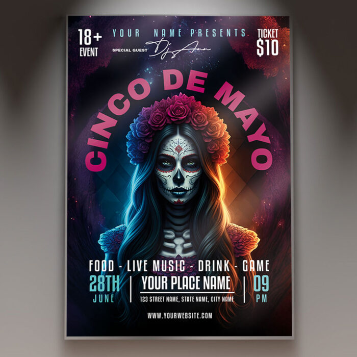 Cinco de Mayo Night Party Flyer TemplateSet the stage for a sizzling evening with our electrifying Cinco de Mayo Night Party Flyer Template! Perfectly crafted to promote your after-dark Cinco de Mayo celebrations at clubs, lounges, bars, or any venue hosting a nighttime fiesta. This flyer template features a captivating design with a blend of vibrant, deep hues, accented with festive elements like neon-style Mexican patterns, silhouettes of partygoers, and perhaps a hint of city lights to emphasize the night-time vibe. It’s designed to instantly convey energy and excitement, enticing your audience to join a night to remember. The Cinco de Mayo Night Party Flyer Template offers a sleek and well-organized layout, ensuring that all the essential information about your event is clearly visible and easy to read even in low-light settings. You can effortlessly customize the text to feature the name of your party, the precise date (May 5th, of course!), the exact start time and any closing hours, the full address of the venue, details about special DJ sets or live music performances, and any exclusive offers on drinks or entry fees for the night. The design often incorporates stylish typography that complements the overall theme, making sure that key details like VIP access or early bird specials really pop and grab attention. Beyond its striking visual appeal and user-friendly customization, the Cinco de Mayo Night Party Flyer Template is engineered for maximum promotional impact across various mediums. It’s optimized for digital platforms, making it ideal for sharing on social media channels like Instagram, Facebook, and TikTok, as well as for embedding on your website or sending out through email newsletters. Additionally, it’s designed to be print-ready, ensuring that any physical posters or flyers you distribute will maintain the same high-quality look and feel, effectively reaching both online and offline audiences and building anticipation for a truly unforgettable Cinco de Mayo night party. Get ready to light up the night – download and customize your flyer today! Features of the Cinco de Mayo Night Party Flyer Template