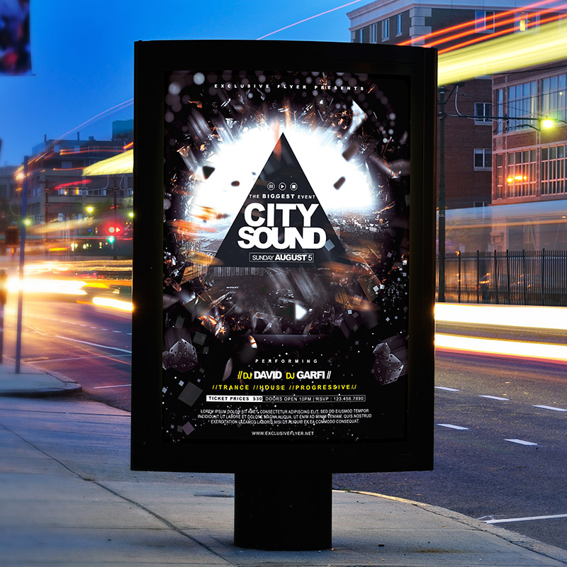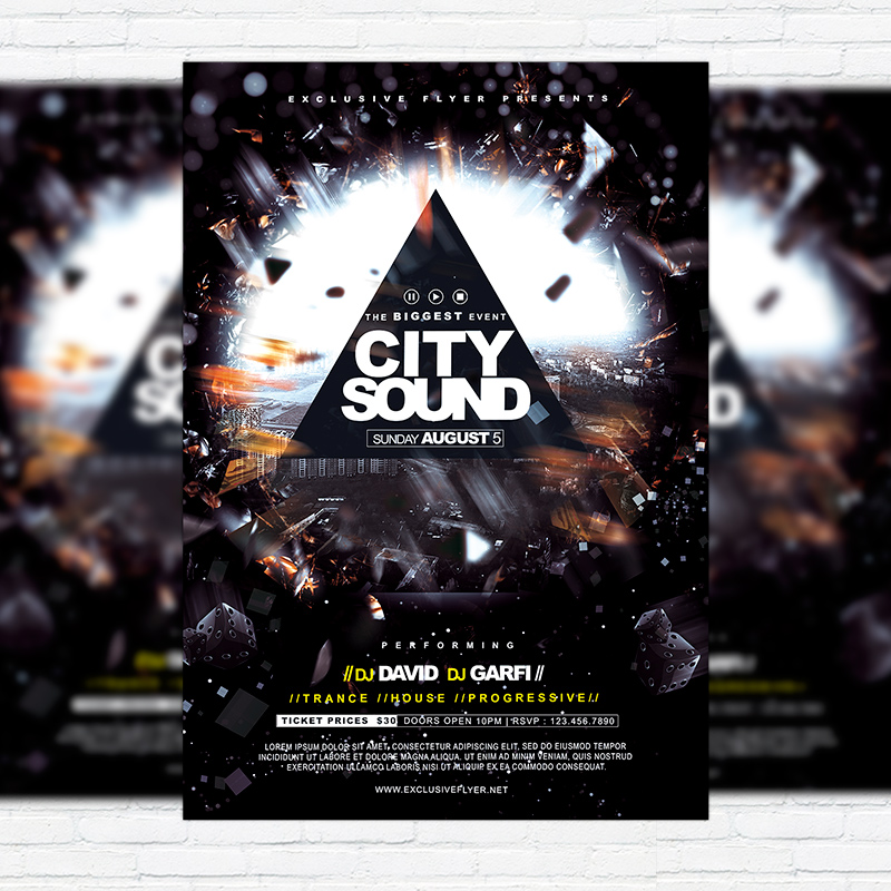 The City Sound is the exclusive Photoshop PSD flyer template designed by ExclusiveFlyer to promote your City Sound Flyer. This is a modern, stylish, black flyer and just be used for a Future Party or maybe Electro Night. Dear customers! – you can also: Customize any flyers or Hire Us to create any unique product. Also, you can get unlimited access to all our templates. You can buy 1 month membership, 3 or 6 months membership or even 1 year membership plan and login on site, choose a design, click the button DOWNLOAD TEMPLATE and it’s yours. No hassle, no checkout! When you paid the template, you can find it in your personal account and of course you’ve got a message to your e-mail (maybe in spam) with link to download. Also, you can find all templates, which you buy, in your personal account! All of our flyers have a very good quality (300DPI). And it means that you just need to download one of them and make the necessary modifications such as replace the elements or choose the colors and start to invite your guests! You can order from us design of Banner Ad, Bi-Fold Brochure, Tri-Fold Brochure, Business Card, Logo, One-Sided Flyer, Two-sided Flyer or Postcard. All you need is to checkout and write us all information on our e-mail or skype. (order now). There are a lot of free flyer templates, free business card templates on our site! Also there are a lot of categories of flyers such as club flyers, seasonal flyers, sport flyers and also business flyers. You have a great choise on our site, so good luck! Don’t forget to follow our Facebook community, our page on Twitter, on Pinterest and on Tumblr and leave comments, cause we work for you! PSD is set up in 1275×1875 dimension (4″×6″ with 0,25″ bleed). The PSD file is very well organised, with color coded groups and layers named appropriately. Remember, all stock images of models and other people used only for demonstration all charms of the flyer and don’t included in the download!