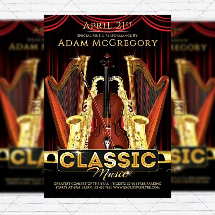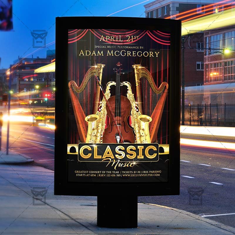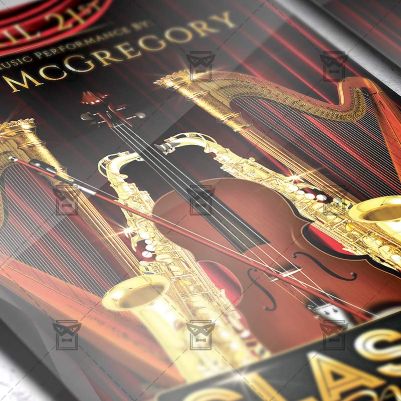 The Classic Music is the exclusive Photoshop PSD flyer template designed by ExclusiveFlyer to promote your Classic Music Night. This is a modern, stylish flyer and just be used for a Operetta Night or Theatre Night etc. Dear customers! – you can also: Customize any flyers or Hire Us to create any unique product. Also, you can get unlimited access to all our templates. You can buy 1 month membership, 3 or 6 months membership or even 1 year membership plan and login on site, choose a design, click the button DOWNLOAD TEMPLATE and it’s yours. No hassle, no checkout! When you paid the template, you can find it in your personal account and of course you’ve got a message to your e-mail (maybe in spam) with link to download. Also, you can find all templates, which you buy, in your personal account! All of our flyers have a very good quality (300DPI). And it means that you just need to download one of them and make the necessary modifications such as replace the elements or choose the colors and start to invite your guests! You can order from us design of Banner Ad, Bi-Fold Brochure, Tri-Fold Brochure, Business Card, Logo, One-Sided Flyer, Two-sided Flyer or Postcard. All you need is to checkout and write us all information on our e-mail or skype. (order now). There are a lot of free flyer templates, free business card templates on our site! Also there are a lot of categories of flyers such as club flyers, seasonal flyers, sport flyers and also business flyers. You have a great choise on our site, so good luck! Don’t forget to follow our Facebook community, our page on Twitter, on Pinterest and on Tumblr and leave comments, cause we work for you! PSD is set up in 1275×1875 dimension (4” x 6” with 0,25” bleed). The PSD file is very well organised, with color coded groups and layers named appropriately. Remember, all stock images of models and other people used only for demonstration all charms of the flyer and don’t included in the download!