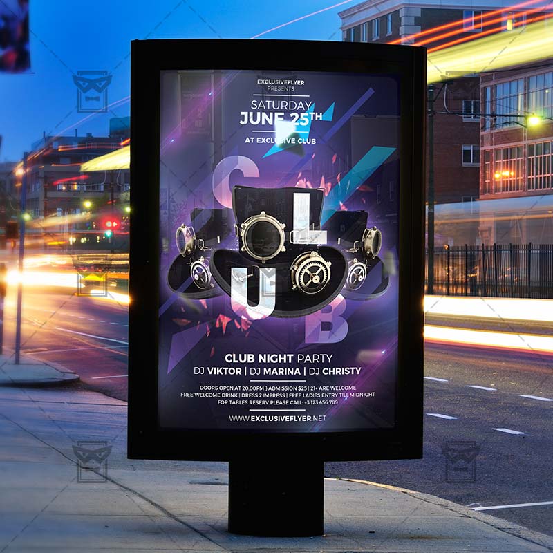 Club Night is an exclusive PSD flyer template for Adobe Photoshop designed by our best graphic designers to facilitate your task in promoting your business. With our readymade Club flyer in psd format you can invite you customers and guest to your event or to the best Club Party, Club Night, Minimal Night or Future Party in their lives.
