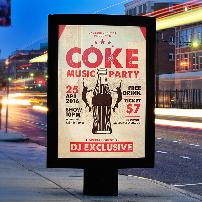 The Coke Music Party is the exclusive Photoshop PSD flyer template designed by ExclusiveFlyer to promote your Coke Music Party . This is a modern, stylish flyer and just be used for a Drink Night or Music Party etc. Dear customers! – you can also: Customize any flyers or Hire Us to create any unique product. Also, you can get unlimited access to all our templates. You can buy 1 month membership, 3 or 6 months membership or even 1 year membership plan and login on site, choose a design, click the button DOWNLOAD TEMPLATE and it’s yours. No hassle, no checkout! When you paid the template, you can find it in your personal account and of course you’ve got a message to your e-mail (maybe in spam) with link to download. Also, you can find all templates, which you buy, in your personal account! All of our flyers have a very good quality (300DPI). And it means that you just need to download one of them and make the necessary modifications such as replace the elements or choose the colors and start to invite your guests! You can order from us design of Banner Ad, Bi-Fold Brochure, Tri-Fold Brochure, Business Card, Logo, One-Sided Flyer, Two-sided Flyer or Postcard. All you need is to checkout and write us all information on our e-mail or skype. (order now). There are a lot of free flyer templates, free business card templates on our site! Also there are a lot of categories of flyers such as club flyers, seasonal flyers, sport flyers and also business flyers. You have a great choise on our site, so good luck! Don’t forget to follow our Facebook community, our page on Twitter, on Pinterest and on Tumblr and leave comments, cause we work for you! PSD is set up in 1275×1875 dimension (4” x 6” with 0,25” bleed). The PSD file is very well organised, with color coded groups and layers named appropriately. Remember, all stock images of models and other people used only for demonstration all charms of the flyer and don’t included in the download!
