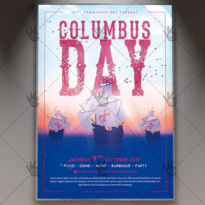 Columbus Day is a simply modern flyer design by PSDmarket Team to be used with Photoshop CS3 and higher. Save your time and use it for business or for your clients! This can be use for Columbus Day Celebration, Columbus Day Party, Columbus Day Night, Columbus Day BBQ, Columbus Night and others.