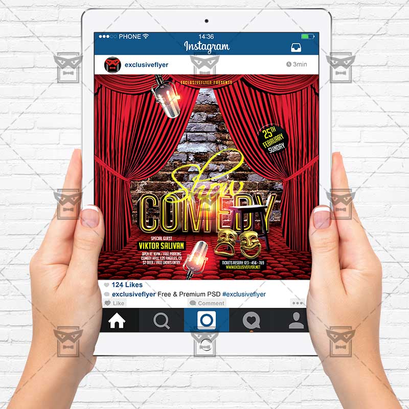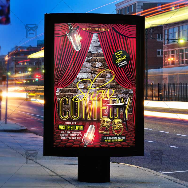 The Comedy Show is the exclusive Photoshop PSD flyer template designed by ExclusiveFlyer to promote your Comedy Show. This is a modern, stylish flyer and just be used for a Comedy Night etc. Dear customers! – you can also: Customize any flyers or Hire Us to create any unique product. Also, you can get unlimited access to all our templates. You can buy 1 month membership, 3 or 6 months membership or even 1 year membership plan and login on site, choose a design, click the button DOWNLOAD TEMPLATE and it’s yours. No hassle, no checkout! When you paid the template, you can find it in your personal account and of course you’ve got a message to your e-mail (maybe in spam) with link to download. Also, you can find all templates, which you buy, in your personal account! All of our flyers have a very good quality (300DPI). And it means that you just need to download one of them and make the necessary modifications such as replace the elements or choose the colors and start to invite your guests! You can order from us design of Banner Ad, Bi-Fold Brochure, Tri-Fold Brochure, Business Card, Logo, One-Sided Flyer, Two-sided Flyer or Postcard. All you need is to checkout and write us all information on our e-mail or skype. (order now). There are a lot of free flyer templates, free business card templates on our site! Also there are a lot of categories of flyers such as club flyers, seasonal flyers, sport flyers and also business flyers. You have a great choise on our site, so good luck! Don’t forget to follow our Facebook community, our page on Twitter, on Pinterest and on Tumblr and leave comments, cause we work for you! PSD is set up in 1275×1875 dimension (4” x 6” with 0,25” bleed). The PSD file is very well organised, with color coded groups and layers named appropriately. Remember, all stock images of models and other people used only for demonstration all charms of the flyer and don’t included in the download!