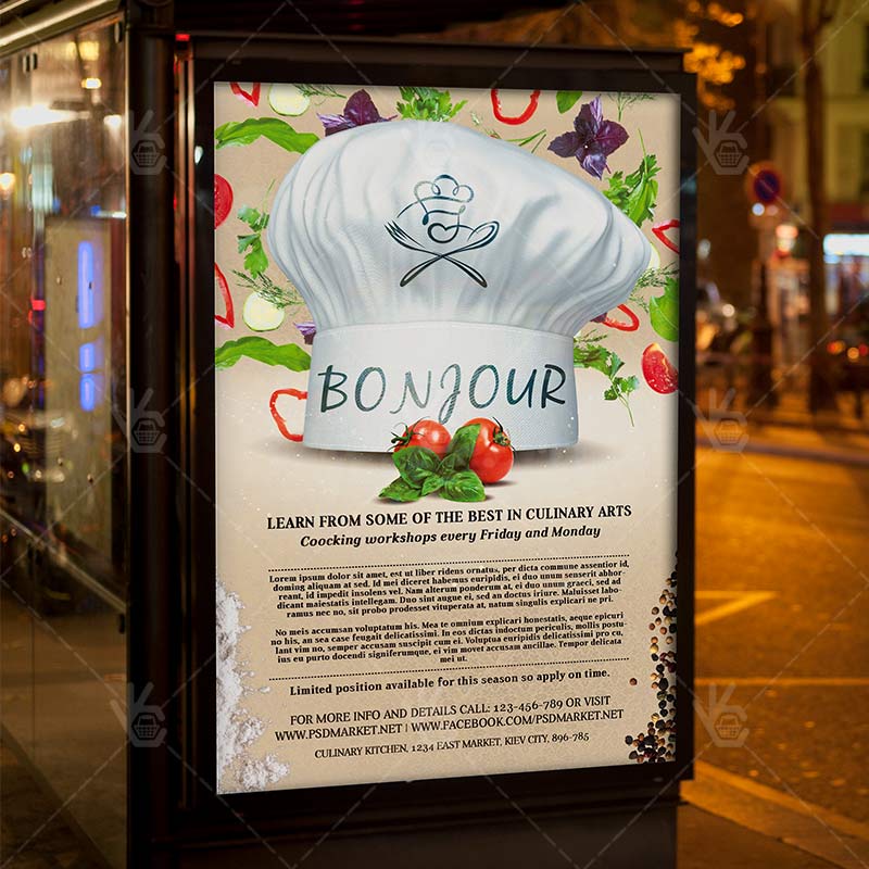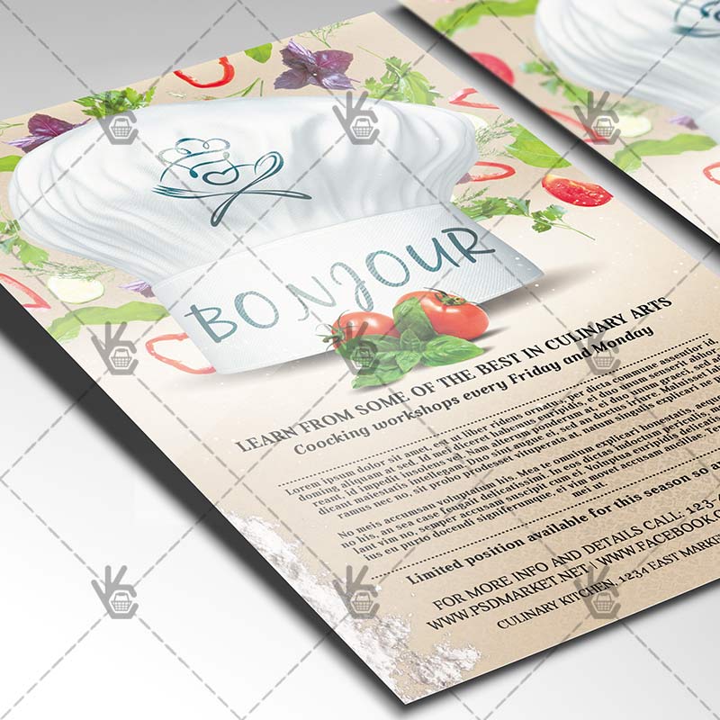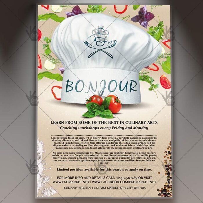 Cooking Class is a simply modern flyer design by PSDmarket Team to be used with Photoshop CS3 and higher. Save your time and use it for business or for your clients! This can be use for Cooking Coaching Classes, Chief Cooking Lessons , Chef Cookout, Cooking Lessons, Culinary Class or Chef Class and others.