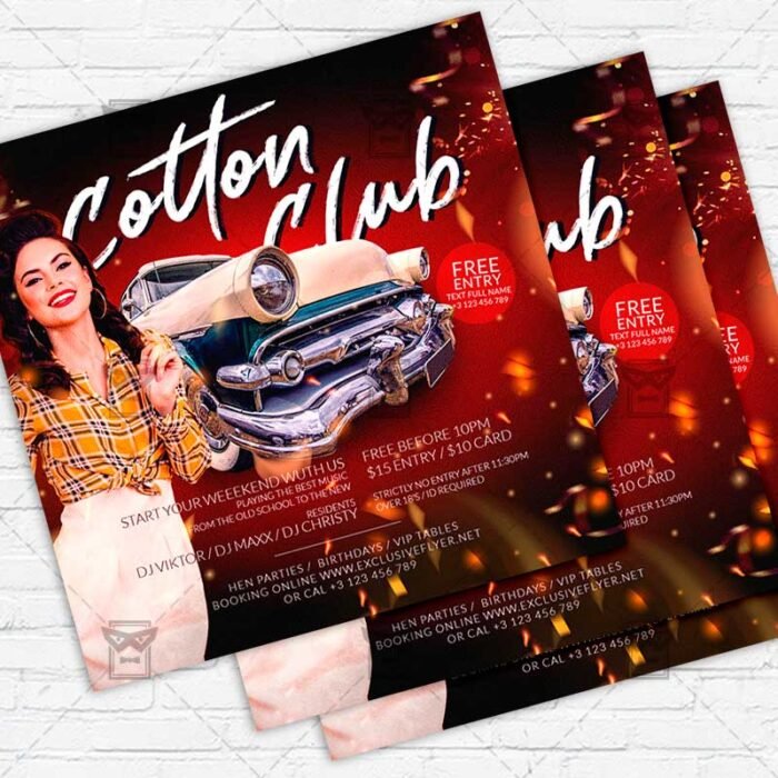 Cotton Club Template an exclusive PSD flyer template for Adobe Photoshop designed by our best graphic designers to facilitate your task in promoting your business. With our readymade Club flyer in psd format you can invite you customers and guest to your event or to the best Cotton Club Night, Cotton Club Party, Night at the Cotton Club or Cotton Club Event in their lives.