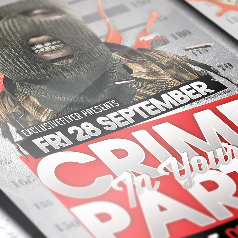 The Crime Party is the exclusive Photoshop PSD flyer/poster template designed by ExclusiveFlyer to promote your Crime Party. This is a modern, stylish, white flyer and just be used for a Dj Party or Crime Night or Music Party etc. Dear customers! – you can also: Customize any flyers or Hire Us to create any unique product. Also, you can get unlimited access to all our templates. You can buy 1 month membership, 3 or 6 months membership or even 1 year membership plan and login on site, choose a design, click the button DOWNLOAD TEMPLATE and it’s yours. No hassle, no checkout! When you paid the template, you can find it in your personal account and of course you’ve got a message to your e-mail (maybe in spam) with link to download. Also, you can find all templates, which you buy, in your personal account! All of our flyers have a very good quality (300DPI). And it means that you just need to download one of them and make the necessary modifications such as replace the elements or choose the colors and start to invite your guests! You can order from us design of Banner Ad, Bi-Fold Brochure, Tri-Fold Brochure, Business Card, Logo, One-Sided Flyer, Two-sided Flyer or Postcard. All you need is to checkout and write us all information on our e-mail or skype. (order now). There are a lot of free flyer templates, free business card templates on our site! Also there are a lot of categories of flyers such as club flyers, seasonal flyers, sport flyers and also business flyers. You have a great choise on our site, so good luck! Don’t forget to follow our Facebook community, our page on Twitter, on Pinterest and on Tumblr and leave comments, cause we work for you! PSD is set up in 1275×1875 dimension (4″×6″ with 0,25″ bleed). The PSD file is very well organised, with color coded groups and layers named appropriately. Remember, all stock images of models and other people used only for demonstration all charms of the flyer and don’t included in the download!