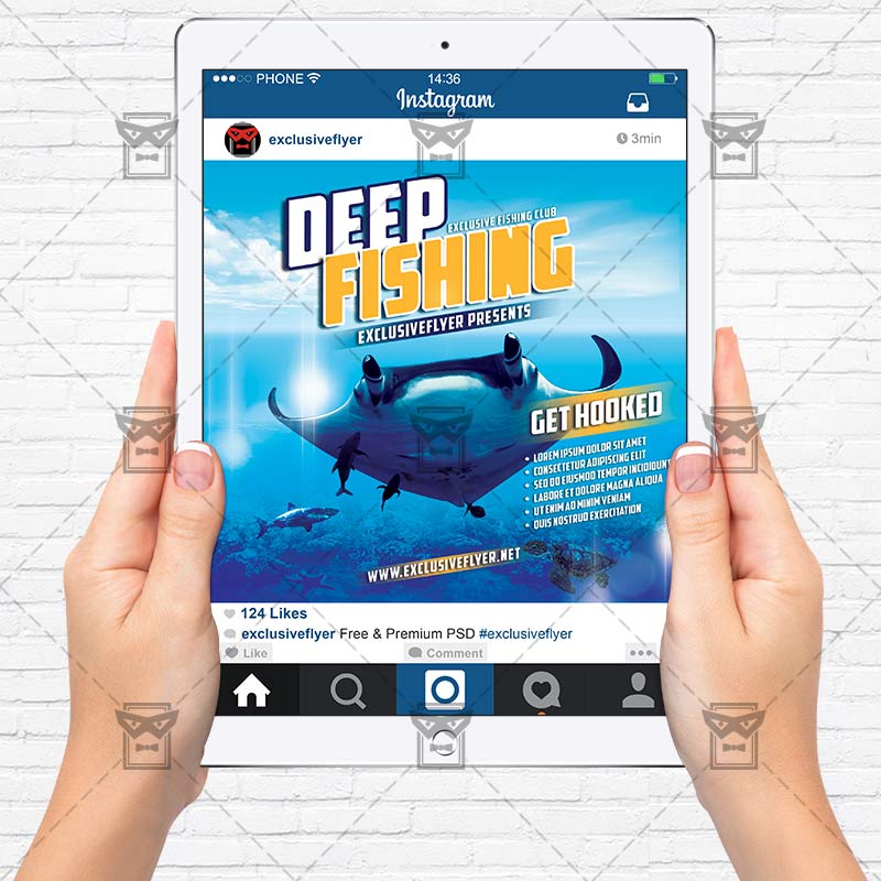 The Deep Fishing is the exclusive Photoshop PSD flyer template designed by ExclusiveFlyer to promote your Deep Fishing Day. This is a modern, stylish flyer and just be used for a Fishing Contest, Fhishing Season Opening etc. Dear customers! – you can also: Customize any flyers or Hire Us to create any unique product. Also, you can get unlimited access to all our templates. You can buy 1 month membership, 3 or 6 months membership or even 1 year membership plan and login on site, choose a design, click the button DOWNLOAD TEMPLATE and it’s yours. No hassle, no checkout! When you paid the template, you can find it in your personal account and of course you’ve got a message to your e-mail (maybe in spam) with link to download. Also, you can find all templates, which you buy, in your personal account! All of our flyers have a very good quality (300DPI). And it means that you just need to download one of them and make the necessary modifications such as replace the elements or choose the colors and start to invite your guests! You can order from us design of Banner Ad, Bi-Fold Brochure, Tri-Fold Brochure, Business Card, Logo, One-Sided Flyer, Two-sided Flyer or Postcard. All you need is to checkout and write us all information on our e-mail or skype. (order now). There are a lot of free flyer templates, free business card templates on our site! Also there are a lot of categories of flyers such as club flyers, seasonal flyers, sport flyers and also business flyers. You have a great choise on our site, so good luck! Don’t forget to follow our Facebook community, our page on Twitter, on Pinterest and on Tumblr and leave comments, cause we work for you! PSD is set up in 1275×1875 dimension (4” x 6” with 0,25” bleed). The PSD file is very well organised, with color coded groups and layers named appropriately. Remember, all stock images of models and other people used only for demonstration all charms of the flyer and don’t included in the download!