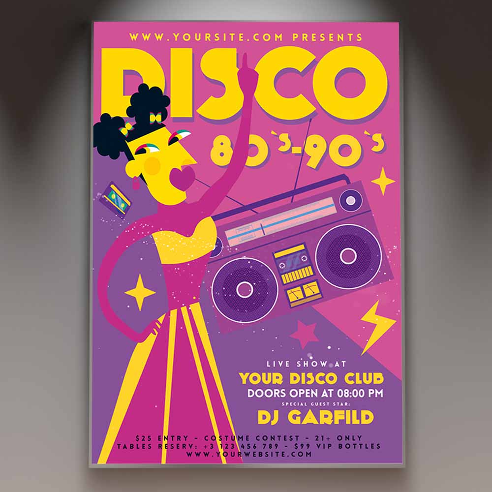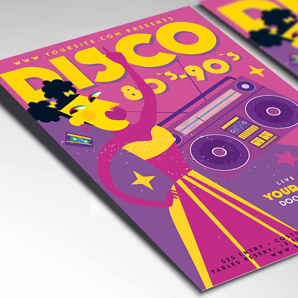 View related Disco 80s-90s Party Card Printable Template Flyer PSD: