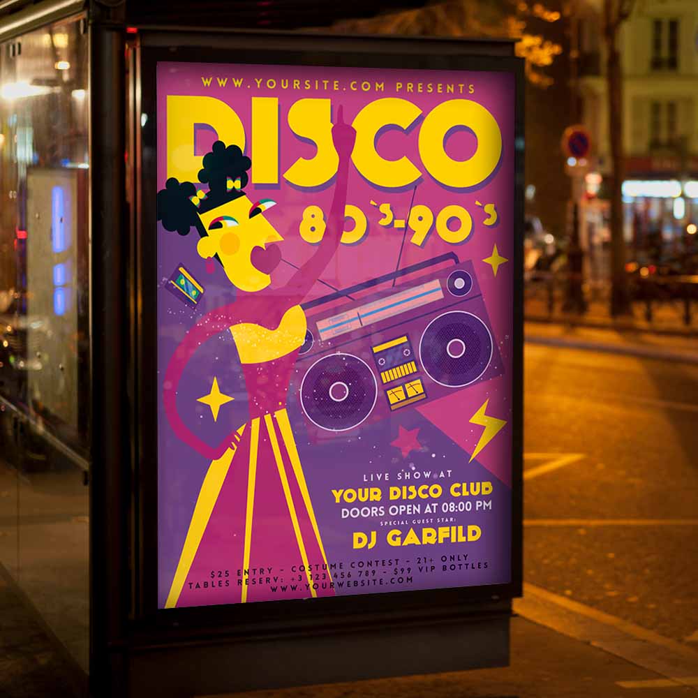 Disco 80s-90s Party Card Printable Template Flyer PSD