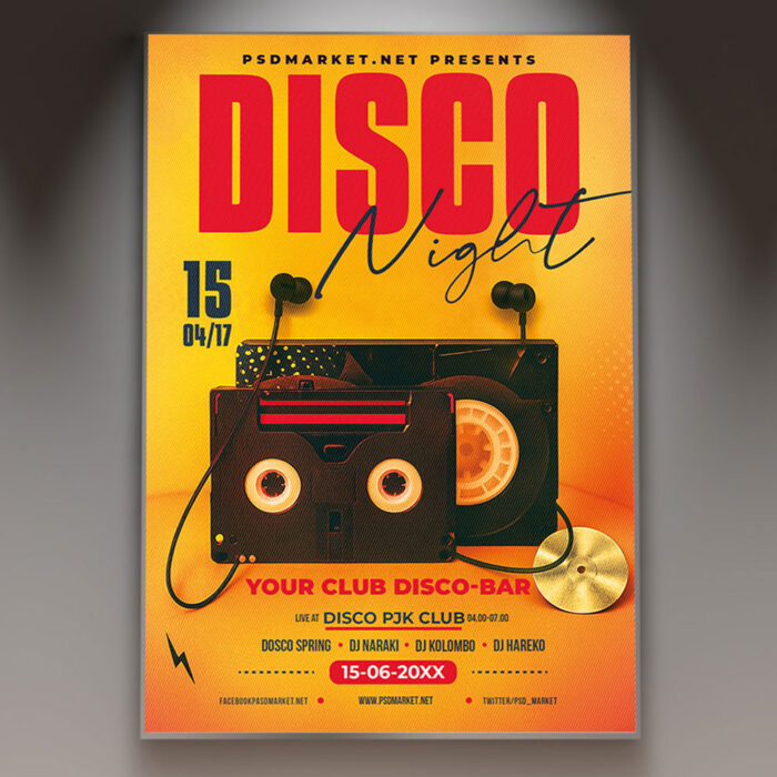 Disco Night Flyer TemplateGet ready to boogie down and light up the dance floor with our dazzling **Disco Night Flyer Template**! This vibrant and energetic design is perfect for promoting any disco-themed event, whether it’s a retro club night, a throwback party, a special DJ set, or a glittering anniversary celebration. If you’re looking to create an irresistible invitation that screams “glamour,” “funk,” and “non-stop dancing,” this flyer template is engineered to draw a massive and enthusiastic crowd. Expect to see striking visuals, often incorporating shimmering **disco balls**, **bright neon colors**, groovy geometric patterns, stylized silhouettes of dancers, and funky, era-specific typography that captures the exhilarating spirit of the disco era. All of this is combined with vibrant light effects that pulse with rhythm and excitement. This template is all about setting an electrifying mood and making your “Disco Night” the ultimate destination for rhythmic celebration! The **Disco Night Flyer Template** offers a highly adaptable and professional layout, ensuring you can clearly communicate all the essential details of your event while perfectly maintaining its glamorous and inviting spirit. You can easily customize the text fields to include the specific date and time of your disco extravaganza, the dazzling venue location, any special dress code suggestions (think sequins, bell-bottoms, and platform shoes!), and information about ticket prices, VIP access, or special drink offers presented in a clear and appealing way. Add an enticing description of what attendees can expect, perhaps highlighting a legendary DJ spinning classic funk and soul, a live band playing iconic disco hits, or a thrilling dance-off competition. Detail any unique features like themed photo booths, light-up dance floors, or roller-skating performances. And of course, include clear contact information or prominent social media handles for further engagement and RSVPs. Many templates also provide exciting options to incorporate additional dynamic graphics like starbursts, glittering confetti, or abstract light patterns, or to adjust the vibrant color palette to perfectly match your brand’s aesthetic or the event’s specific disco theme. This lets you create a truly unique and memorable promotional piece that looks as lively and dazzling as your party feels. Engineered for maximum reach, the **Disco Night Flyer Template** is designed to be both print-ready for stunning physical distribution and seamlessly optimized for digital sharing. This ensures your exciting invitation reaches a wide and enthusiastic audience. Create eye-catching physical flyers to distribute at local clubs, bars, vintage stores, or community centers. Effortlessly share the flyer digitally through various social media channels with engaging captions that highlight the night’s groovy vibes, email announcements that build anticipation, and online event listings that attract dance enthusiasts and nostalgia lovers. This dual functionality helps to maximize visibility and create significant buzz around your Disco Night. By utilizing this distinctive and attention-grabbing flyer template, you’re not just announcing a party; you’re creating an invitation that broadcasts pure fun and promises an experience filled with rhythmic beats, shimmering lights, and unforgettable dance moves, making your “Disco Night” the ultimate destination for a night of pure exhilaration. Grab this template today and prepare to bring the funk! — Features of the Disco Night Flyer Template
