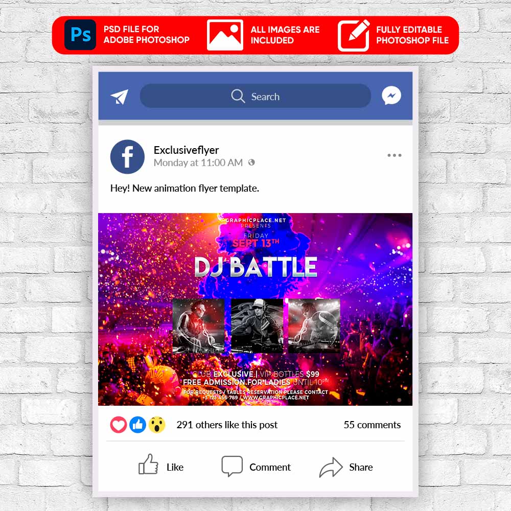 Dj Battle Night Social Media Animated Flyer Template is great to promote your party, night club, festival, music show, karaoke bar, restaurant, sport bar, beer pub etc. You are welcome to download or buy any Animated Flyer Template in PSD from Exclusiveflyer.net and become really successful! It is your exclusive chance to save your time and a lot of money, just use our ready-made PSD Motion Flyers for promoting your events on Facebook with facebook covers, on Instagram or any other social network with square size videos!