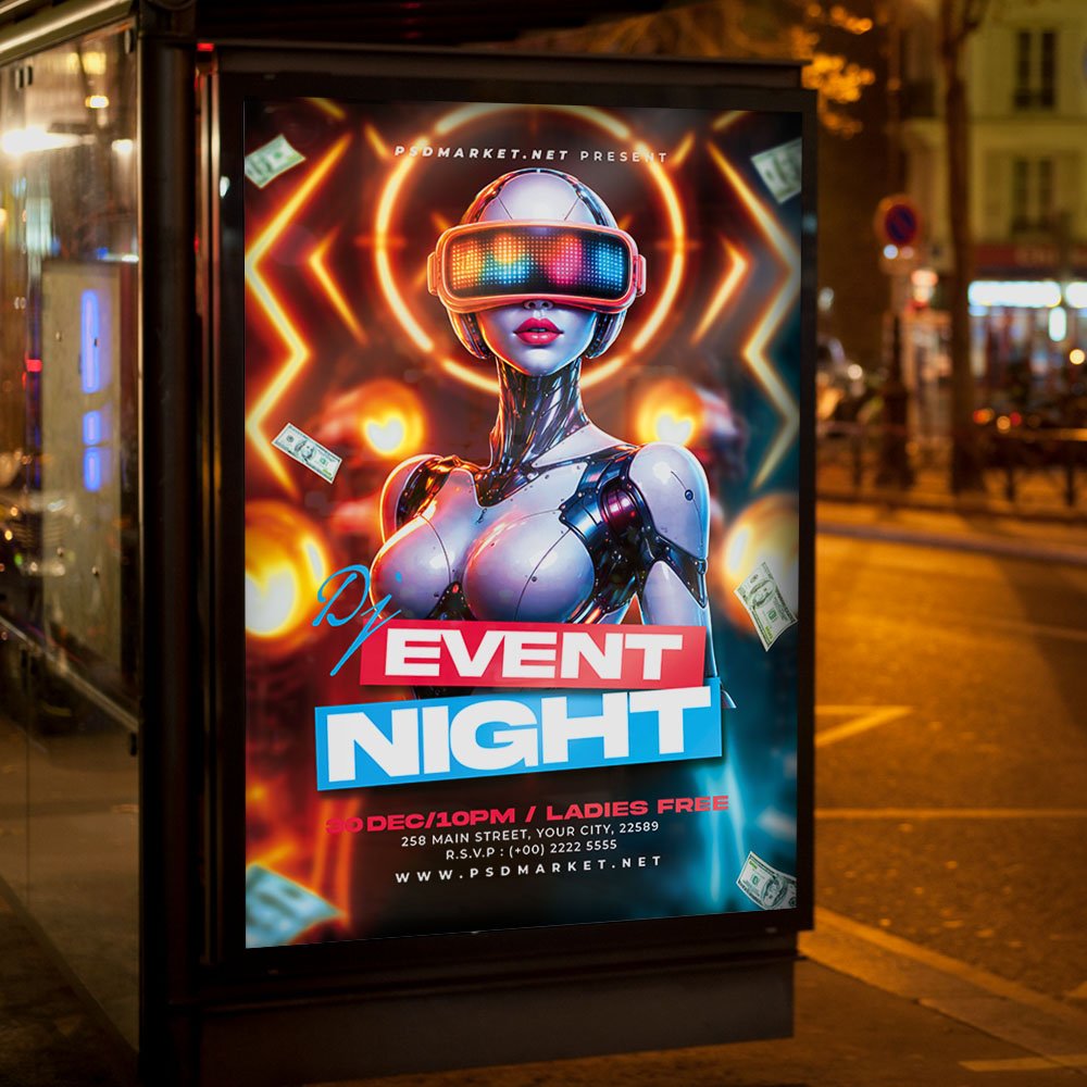 DJ Event Night 2026 Flyer TemplateIgnite the dance floor and showcase your headliner like never before! Our DJ Event Night 2026 Flyer Template is a professional-grade design tool crafted for club owners, music producers, and event promoters who want to define the 2026 nightlife experience. This premium PSD template is engineered to capture the raw energy of modern music scenes, whether you are hosting a deep house residency, a high-octane EDM festival, or an exclusive techno warehouse session. If you need a visual that screams “The Sound of 2026,” “Join the Rhythm,” or “The Most Anticipated Set of the Year,” this flyer is your ultimate solution. Featuring immersive 3D audio elements, pulsating neon light trails, and bold, futuristic typography, it puts your DJ at the heart of the action. The color palette—a sophisticated mix of electric ultraviolet, deep bass blacks, and vibrant cyan highlights—perfectly sets the vibe for a high-end DJ Event Night. The DJ Event Night 2026 Flyer Template offers a meticulously organized and fully layered layout, ensuring that your branding is as precise as the beat. As a fully editable Photoshop file, it provides total creative freedom to match the specific energy of your event. You can easily update text fields for your guest DJ, supporting acts, venue location, and ticket links. Highlight exclusive features such as immersive laser mapping, VIP backstage access, state-of-the-art 2026 sound systems, or early bird drink specials. Because it is a high-resolution PSD, you can adjust the neon intensity, modify the background smoke effects, and fine-tune the color saturation to ensure your DJ Event Night promotion looks as sharp and professional as a global festival poster. Designed for the digital-first marketing landscape, the DJ Event Night Flyer Template is 100% print-ready and expertly optimized for social media dominance. You can produce high-quality physical posters and handbills for local promotion while simultaneously exporting perfectly sized versions for Instagram, TikTok, and Facebook. This ensures your message reaches the hardcore clubbing community across all platforms, building the massive anticipation needed for a sold-out night. By choosing this distinctive and high-impact flyer template, you aren’t just announcing a party; you’re promising an immersive audio-visual journey. Make your “DJ Event Night 2026” the essential destination for music lovers. Download this template today and launch your promotion with professional-grade energy! — Features of the DJ Event Night 2026 Flyer Template