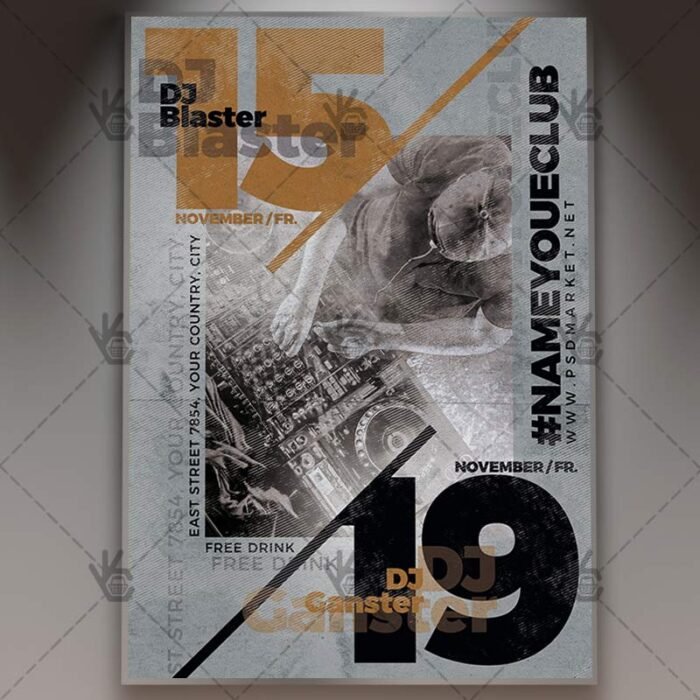 Dj Flyer is a simply modern flyer design by PSDmarket Team to be used with Photoshop CS3 and higher. Save your time and use it for business or for your clients! This can be use for Dj, Club, Fancy Fridays, Club Party, Club Night, DJ Guest, DJ Party Night, DJ Party, DJ Day, International Dj Day, Dj Battle Night, DJ Festival, Dj Club Party and others.