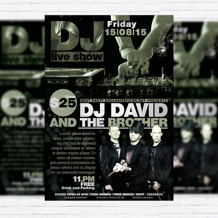 The DJ Live Show Vol2 is the exclusive Photoshop PSD flyer template designed by ExclusiveFlyer to promote your DJ Live Show Party. This is a modern, stylish, black flyer and just be used for a DJ Party or DJ Night or DJ Battle etc. Dear customers! – you can also: Customize any flyers or Hire Us to create any unique product. Also, you can get unlimited access to all our templates. You can buy 1 month membership, 3 or 6 months membership or even 1 year membership plan and login on site, choose a design, click the button DOWNLOAD TEMPLATE and it’s yours. No hassle, no checkout! When you paid the template, you can find it in your personal account and of course you’ve got a message to your e-mail (maybe in spam) with link to download. Also, you can find all templates, which you buy, in your personal account! All of our flyers have a very good quality (300DPI). And it means that you just need to download one of them and make the necessary modifications such as replace the elements or choose the colors and start to invite your guests! You can order from us design of Banner Ad, Bi-Fold Brochure, Tri-Fold Brochure, Business Card, Logo, One-Sided Flyer, Two-sided Flyer or Postcard. All you need is to checkout and write us all information on our e-mail or skype. (order now). There are a lot of free flyer templates, free business card templates on our site! Also there are a lot of categories of flyers such as club flyers, seasonal flyers, sport flyers and also business flyers. You have a great choise on our site, so good luck! Don’t forget to follow our Facebook community, our page on Twitter, on Pinterest and on Tumblr and leave comments, cause we work for you! PSD is set up in 1275×1875 dimension (4″×6″ with 0,25″ bleed). The PSD file is very well organised, with color coded groups and layers named appropriately. Remember, all stock images of models and other people used only for demonstration all charms of the flyer and don’t included in the download!