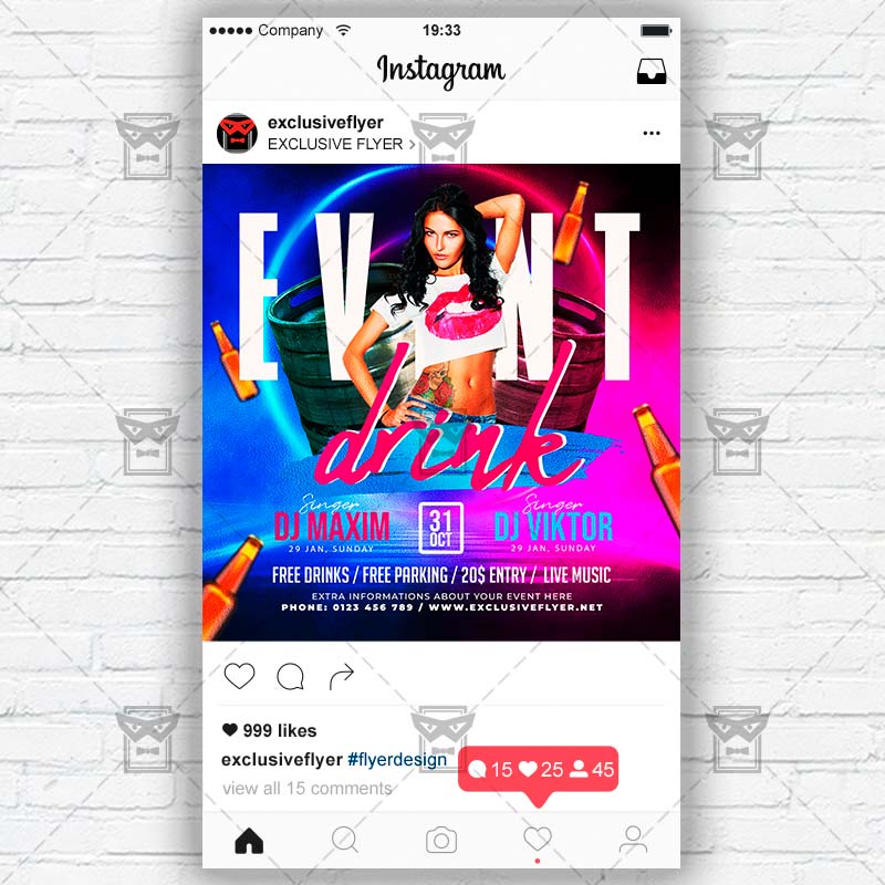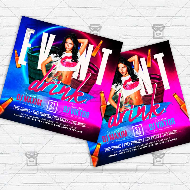 Drink Event Template an exclusive PSD flyer template for Adobe Photoshop designed by our best graphic designers to facilitate your task in promoting your business. With our readymade Club flyer in psd format you can invite you customers and guest to your event or to the best Party Club, Girls Night, Party Online, Girls Night Out Party, Live Show Night, Online Show. Online Dj Battle, Online Party On in their lives.