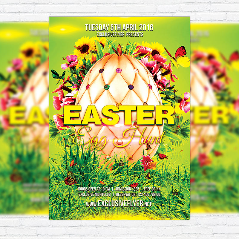 The Easter Egg Hunt is the exclusive Photoshop PSD flyer template designed by ExclusiveFlyer to promote your Easter Egg Hunt Party. This is a modern, stylish flyer and just be used for a Happy Easter Night or Easter Party or Spring Party etc. Dear customers! – you can also: Customize any flyers or Hire Us to create any unique product. Also, you can get unlimited access to all our templates. You can buy 1 month membership, 3 or 6 months membership or even 1 year membership plan and login on site, choose a design, click the button DOWNLOAD TEMPLATE and it’s yours. No hassle, no checkout! When you paid the template, you can find it in your personal account and of course you’ve got a message to your e-mail (maybe in spam) with link to download. Also, you can find all templates, which you buy, in your personal account! All of our flyers have a very good quality (300DPI). And it means that you just need to download one of them and make the necessary modifications such as replace the elements or choose the colors and start to invite your guests! You can order from us design of Banner Ad, Bi-Fold Brochure, Tri-Fold Brochure, Business Card, Logo, One-Sided Flyer, Two-sided Flyer or Postcard. All you need is to checkout and write us all information on our e-mail or skype. (order now). There are a lot of free flyer templates, free business card templates on our site! Also there are a lot of categories of flyers such as club flyers, seasonal flyers, sport flyers and also business flyers. You have a great choise on our site, so good luck! Don’t forget to follow our Facebook community, our page on Twitter, on Pinterest and on Tumblr and leave comments, cause we work for you! PSD is set up in 1275×1875 dimension (4” x 6” with 0,25” bleed). The PSD file is very well organised, with color coded groups and layers named appropriately. Remember, all stock images of models and other people used only for demonstration all charms of the flyer and don’t included in the download!