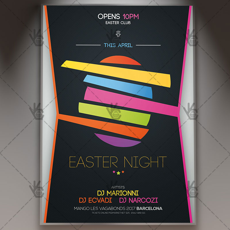 Easter Night is a simply modern flyer design by PSDmarket Team to be used with Photoshop CS3 and higher. Save your time and use it for business or for your clients! This can be use for Happy Easter, Easter Night , Easter Celebration, Easter Event, Easter Egg Hunt or Egg Party and others.