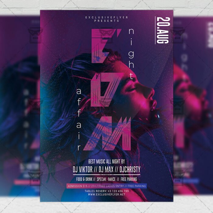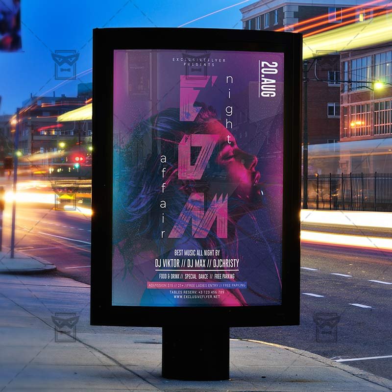 EDM Night Affair an exclusive PSD flyer template for Adobe Photoshop designed by our best graphic designers to facilitate your task in promoting your business. With our readymade Club flyer in psd format you can invite you customers and guest to your event or to the best EDM Party, Electro Night, Dancehall Queen Party or Dance Party Night in their lives.