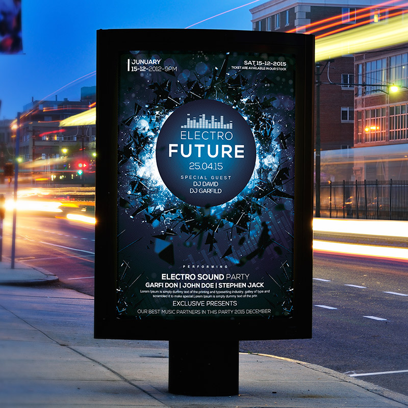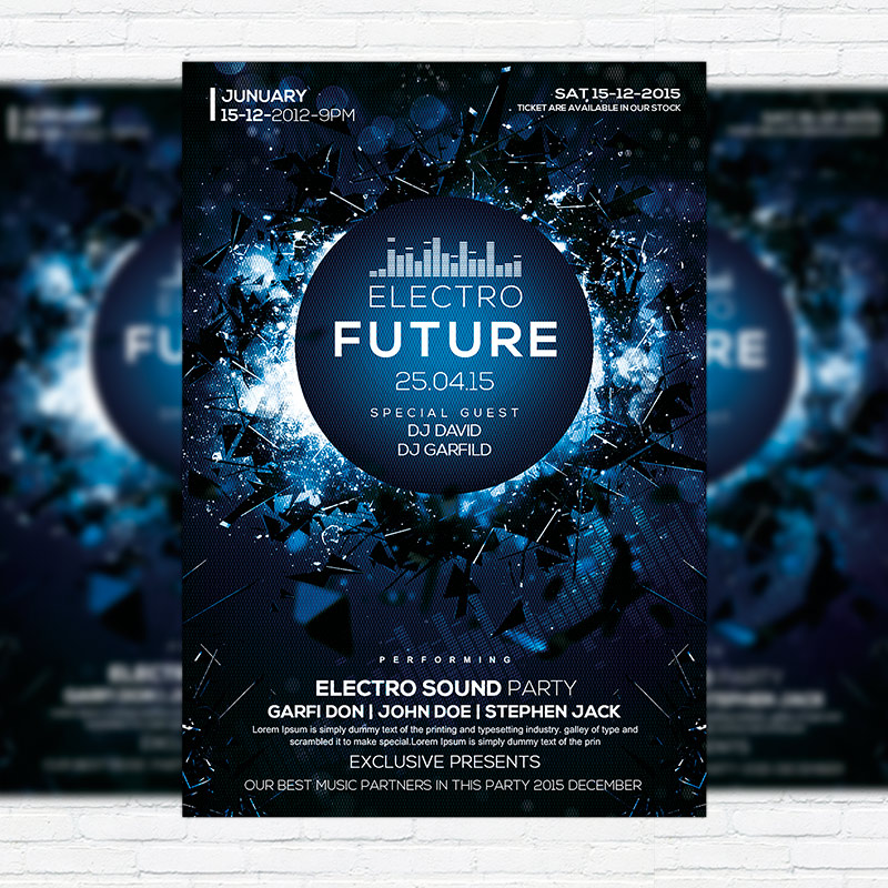 The Electro Future is the exclusive Photoshop PSD flyer template designed by ExclusiveFlyer to promote your Electro Future. This is a modern, stylish, white flyer and just be used for a Future Party or maybe Electro Night. Dear customers! – you can also: Customize any flyers or Hire Us to create any unique product. Also, you can get unlimited access to all our templates. You can buy 1 month membership, 3 or 6 months membership or even 1 year membership plan and login on site, choose a design, click the button DOWNLOAD TEMPLATE and it’s yours. No hassle, no checkout! When you paid the template, you can find it in your personal account and of course you’ve got a message to your e-mail (maybe in spam) with link to download. Also, you can find all templates, which you buy, in your personal account! All of our flyers have a very good quality (300DPI). And it means that you just need to download one of them and make the necessary modifications such as replace the elements or choose the colors and start to invite your guests! You can order from us design of Banner Ad, Bi-Fold Brochure, Tri-Fold Brochure, Business Card, Logo, One-Sided Flyer, Two-sided Flyer or Postcard. All you need is to checkout and write us all information on our e-mail or skype. (order now). There are a lot of free flyer templates, free business card templates on our site! Also there are a lot of categories of flyers such as club flyers, seasonal flyers, sport flyers and also business flyers. You have a great choise on our site, so good luck! Don’t forget to follow our Facebook community, our page on Twitter, on Pinterest and on Tumblr and leave comments, cause we work for you! PSD is set up in 1275×1875 dimension (4″×6″ with 0,25″ bleed). The PSD file is very well organised, with color coded groups and layers named appropriately. Remember, all stock images of models and other people used only for demonstration all charms of the flyer and don’t included in the download!