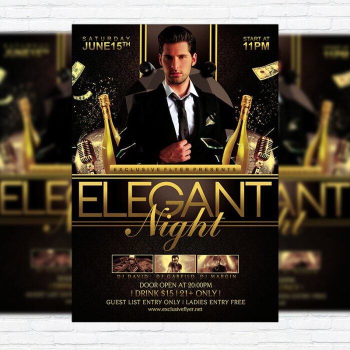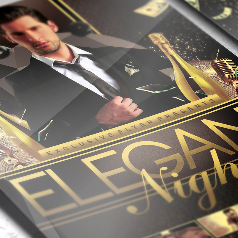 The Elegant Night is the exclusive Photoshop PSD flyer/poster template designed by ExclusiveFlyer to promote your Elegant Night. This is a modern, stylish, black flyer and just be used for a Elegant Party or Exclusive Party. Dear customers! – you can also: Customize any flyers or Hire Us to create any unique product. Also, you can get unlimited access to all our templates. You can buy 1 month membership, 3 or 6 months membership or even 1 year membership plan and login on site, choose a design, click the button DOWNLOAD TEMPLATE and it’s yours. No hassle, no checkout! When you paid the template, you can find it in your personal account and of course you’ve got a message to your e-mail (maybe in spam) with link to download. Also, you can find all templates, which you buy, in your personal account! All of our flyers have a very good quality (300DPI). And it means that you just need to download one of them and make the necessary modifications such as replace the elements or choose the colors and start to invite your guests! You can order from us design of Banner Ad, Bi-Fold Brochure, Tri-Fold Brochure, Business Card, Logo, One-Sided Flyer, Two-sided Flyer or Postcard. All you need is to checkout and write us all information on our e-mail or skype. (order now). There are a lot of free flyer templates, free business card templates on our site! Also there are a lot of categories of flyers such as club flyers, seasonal flyers, sport flyers and also business flyers. You have a great choise on our site, so good luck! Don’t forget to follow our Facebook community, our page on Twitter, on Pinterest and on Tumblr and leave comments, cause we work for you! PSD is set up in 1275×1875 dimension (4″×6″ with 0,25″ bleed). The PSD file is very well organised, with color coded groups and layers named appropriately. Remember, all stock images of models and other people used only for demonstration all charms of the flyer and don’t included in the download!