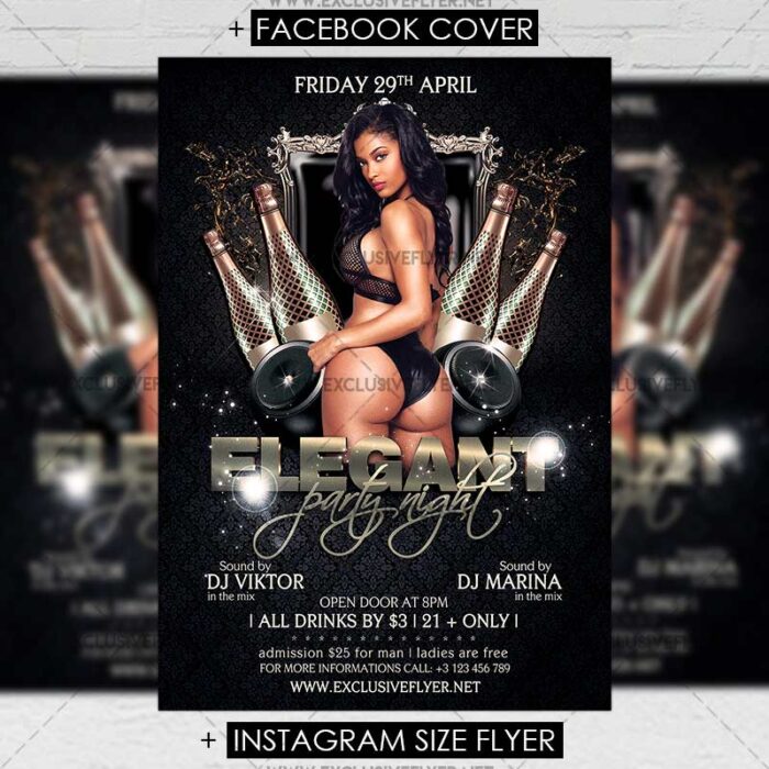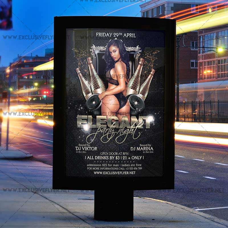 If you want to make your party more elegant, you need to buy our Elegant PSD Flyer Template. This great layout can be use not only for elegant party, but for any luxury or birthday celebration party. In the middle of this flyer you can see hot sexy girl in black bikini, gold 3D bittles and black speakers with lights. This grandiose template is 100% editable and you can change all text information and replace all images and decorative elements with your own. So, join us and have a unique exclusive PSD flyer templates every day! Dear customers! – you can also: Customize any flyers or Hire Us to create any unique product. Also, you can get unlimited access to all our templates. You can buy 1 month membership, 3 or 6 months membership or even 1 year membership plan and login on site, choose a design, click the button DOWNLOAD TEMPLATE and it’s yours. No hassle, no checkout! When you paid the template, you can find it in your personal account and of course you’ve got a message to your e-mail (maybe in spam) with link to download. Also, you can find all templates, which you buy, in your personal account! All of our flyers have a very good quality (300DPI). And it means that you just need to download one of them and make the necessary modifications such as replace the elements or choose the colors and start to invite your guests! You can order from us design of Banner Ad, Bi-Fold Brochure, Tri-Fold Brochure, Business Card, Logo, One-Sided Flyer, Two-sided Flyer or Postcard. All you need is to checkout and write us all information on our e-mail or skype. (order now). There are a lot of free flyer templates, free business card templates on our site! Also there are a lot of categories of flyers such as club flyers, seasonal flyers, sport flyers and also business flyers. You have a great choise on our site, so good luck! Don’t forget to follow our Facebook community, our page on Twitter, on Pinterest and on Tumblr and leave comments, cause we work for you! PSD is set up in 1819×2551 dimension. The PSD file is very well organised, with color coded groups and layers named appropriately. Remember, all stock images of models and other people used only for demonstration all charms of the flyer and don’t included in the download!