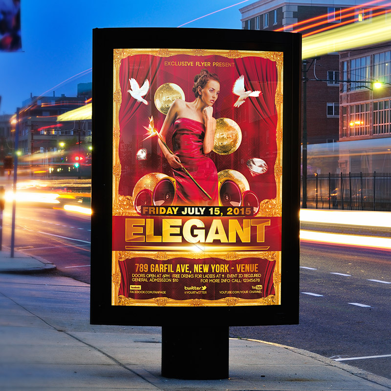 The Elegant is the exclusive Photoshop PSD flyer/poster template designed by ExclusiveFlyer to promote your Elegant. This is a modern, stylish, orange flyer and just be used for a Elegant Party or Exclusive Party. Dear customers! – you can also: Customize any flyers or Hire Us to create any unique product. Also, you can get unlimited access to all our templates. You can buy 1 month membership, 3 or 6 months membership or even 1 year membership plan and login on site, choose a design, click the button DOWNLOAD TEMPLATE and it’s yours. No hassle, no checkout! When you paid the template, you can find it in your personal account and of course you’ve got a message to your e-mail (maybe in spam) with link to download. Also, you can find all templates, which you buy, in your personal account! All of our flyers have a very good quality (300DPI). And it means that you just need to download one of them and make the necessary modifications such as replace the elements or choose the colors and start to invite your guests! You can order from us design of Banner Ad, Bi-Fold Brochure, Tri-Fold Brochure, Business Card, Logo, One-Sided Flyer, Two-sided Flyer or Postcard. All you need is to checkout and write us all information on our e-mail or skype. (order now). There are a lot of free flyer templates, free business card templates on our site! Also there are a lot of categories of flyers such as club flyers, seasonal flyers, sport flyers and also business flyers. You have a great choise on our site, so good luck! Don’t forget to follow our Facebook community, our page on Twitter, on Pinterest and on Tumblr and leave comments, cause we work for you! PSD is set up in 1275×1875 dimension (4″×6″ with 0,25″ bleed). The PSD file is very well organised, with color coded groups and layers named appropriately. Remember, all stock images of models and other people used only for demonstration all charms of the flyer and don’t included in the download!