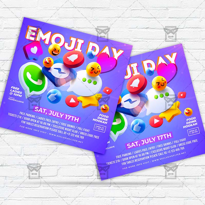 Emoji Day Template an exclusive PSD flyer template for Adobe Photoshop designed by our best graphic designers to facilitate your task in promoting your business. With our readymade Club flyer in psd format you can invite you customers and guest to your event or to the best Party Club, Girls Night, Party Online, Girls Night Out Party, Live Show Night, Online Show. Online Dj Battle, Online Party On in their lives.