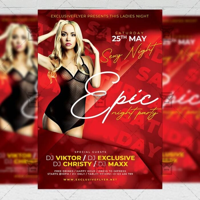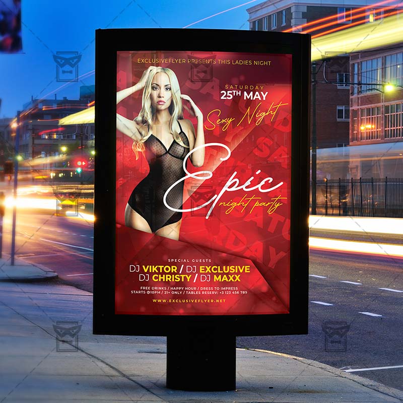 Epic Night Party Template an exclusive PSD flyer template for Adobe Photoshop designed by our best graphic designers to facilitate your task in promoting your business. With our readymade Club flyer in psd format you can invite you customers and guest to your event or to the best Epic Party, Epic Night, Sexy Party, Ladies Party Night, Hot Night or Club Dj Party their lives.
