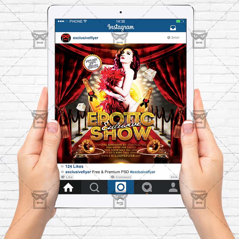 The Exclusive Erotic Show is the exclusive Photoshop PSD flyer template designed by ExclusiveFlyer to promote your Exclusive Erotic Show. This is a modern, stylish flyer and just be used for a Broadway Show, Burlesque Show, Gatsby Live Show etc. Dear customers! – you can also: Customize any flyers or Hire Us to create any unique product. Also, you can get unlimited access to all our templates. You can buy 1 month membership, 3 or 6 months membership or even 1 year membership plan and login on site, choose a design, click the button DOWNLOAD TEMPLATE and it’s yours. No hassle, no checkout! When you paid the template, you can find it in your personal account and of course you’ve got a message to your e-mail (maybe in spam) with link to download. Also, you can find all templates, which you buy, in your personal account! All of our flyers have a very good quality (300DPI). And it means that you just need to download one of them and make the necessary modifications such as replace the elements or choose the colors and start to invite your guests! You can order from us design of Banner Ad, Bi-Fold Brochure, Tri-Fold Brochure, Business Card, Logo, One-Sided Flyer, Two-sided Flyer or Postcard. All you need is to checkout and write us all information on our e-mail or skype. (order now). There are a lot of free flyer templates, free business card templates on our site! Also there are a lot of categories of flyers such as club flyers, seasonal flyers, sport flyers and also business flyers. You have a great choise on our site, so good luck! Don’t forget to follow our Facebook community, our page on Twitter, on Pinterest and on Tumblr and leave comments, cause we work for you! PSD is set up in 1275×1875 dimension (4” x 6” with 0,25” bleed). The PSD file is very well organised, with color coded groups and layers named appropriately. Remember, all stock images of models and other people used only for demonstration all charms of the flyer and don’t included in the download!