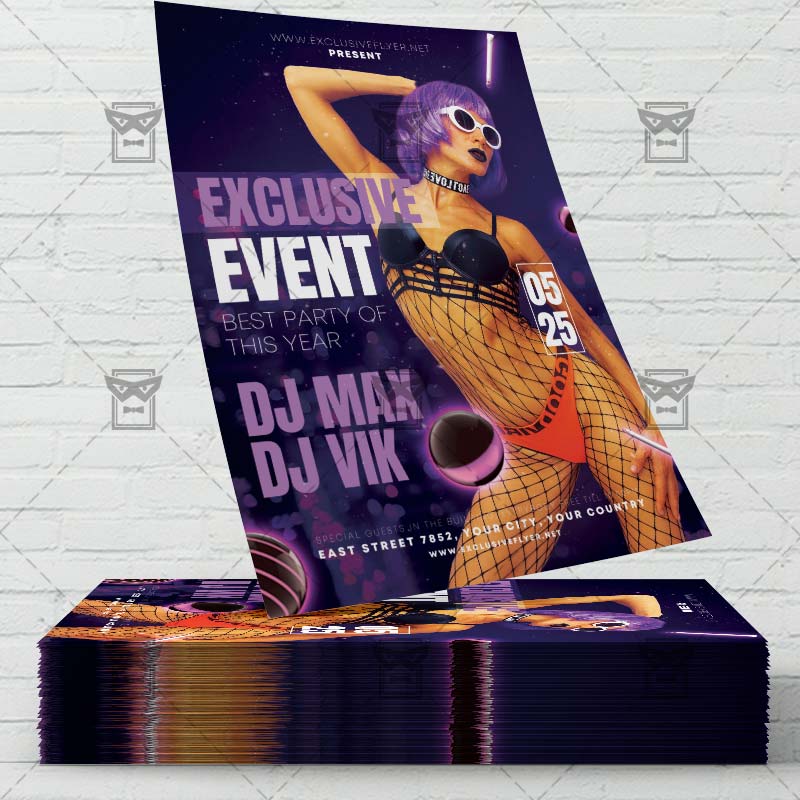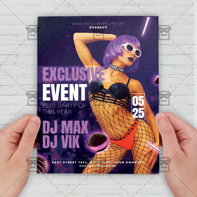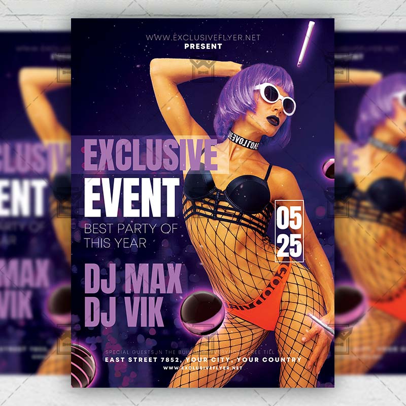 Exclusive Event Template an exclusive PSD flyer template for Adobe Photoshop designed by our best graphic designers to facilitate your task in promoting your business. This psd poster/flyer is the best choice for Party Club, Girls Night, Party Online, Girls Night Out Party, Live Show Night, Online Show, Online Dj Battle, Online Party On. With our readymade Exclusive Event flyer in psd format you can invite you customers and guest to your event with a minimum of efforts and time.