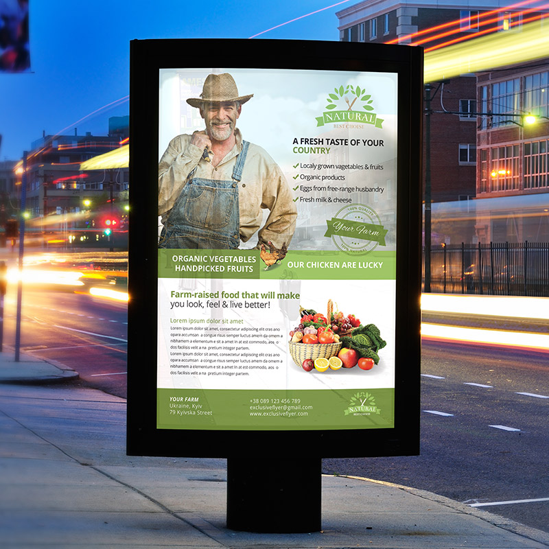 The Farmer Flyer is the exclusive Photoshop PSD flyer template designed by ExclusiveFlyer to promote your Farm. This is a modern, stylish, nature flyer and just be used for a Farm. Dear customers! – you can also: Customize any flyers or Hire Us to create any unique product. Also, you can get unlimited access to all our templates. You can buy 1 month membership, 3 or 6 months membership or even 1 year membership plan and login on site, choose a design, click the button DOWNLOAD TEMPLATE and it’s yours. No hassle, no checkout! When you paid the template, you can find it in your personal account and of course you’ve got a message to your e-mail (maybe in spam) with link to download. Also, you can find all templates, which you buy, in your personal account! All of our flyers have a very good quality (300DPI). And it means that you just need to download one of them and make the necessary modifications such as replace the elements or choose the colors and start to invite your guests! You can order from us design of Banner Ad, Bi-Fold Brochure, Tri-Fold Brochure, Business Card, Logo, One-Sided Flyer, Two-sided Flyer or Postcard. All you need is to checkout and write us all information on our e-mail or skype. (order now). There are a lot of free flyer templates, free business card templates on our site! Also there are a lot of categories of flyers such as club flyers, seasonal flyers, sport flyers and also business flyers. You have a great choise on our site, so good luck! Don’t forget to follow our Facebook community, our page on Twitter, on Pinterest and on Tumblr and leave comments, cause we work for you! PSD is set up in 1275×1875 dimension (4″×6″ with 0,25″ bleed). The PSD file is very well organised, with color coded groups and layers named appropriately. Remember, all stock images of models and other people used only for demonstration all charms of the flyer and don’t included in the download!