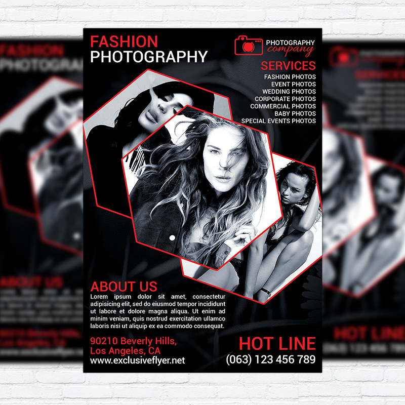 The Fashion Photography is the exclusive Photoshop PSD flyer template designed by ExclusiveFlyer to promote your Business. This is a modern, stylish flyer and just be used for a Fashion Photography or Photography etc. Dear customers! – you can also: Customize any flyers or Hire Us to create any unique product. Also, you can get unlimited access to all our templates. You can buy 1 month membership, 3 or 6 months membership or even 1 year membership plan and login on site, choose a design, click the button DOWNLOAD TEMPLATE and it’s yours. No hassle, no checkout! When you paid the template, you can find it in your personal account and of course you’ve got a message to your e-mail (maybe in spam) with link to download. Also, you can find all templates, which you buy, in your personal account! All of our flyers have a very good quality (300DPI). And it means that you just need to download one of them and make the necessary modifications such as replace the elements or choose the colors and start to invite your guests! You can order from us design of Banner Ad, Bi-Fold Brochure, Tri-Fold Brochure, Business Card, Logo, One-Sided Flyer, Two-sided Flyer or Postcard. All you need is to checkout and write us all information on our e-mail or skype. (order now). There are a lot of free flyer templates, free business card templates on our site! Also there are a lot of categories of flyers such as club flyers, seasonal flyers, sport flyers and also business flyers. You have a great choise on our site, so good luck! Don’t forget to follow our Facebook community, our page on Twitter, on Pinterest and on Tumblr and leave comments, cause we work for you! PSD is set up in 1275×1875 dimension (4” x 6” with 0,25” bleed). The PSD file is very well organised, with color coded groups and layers named appropriately. Remember, all stock images of models and other people used only for demonstration all charms of the flyer and don’t included in the download!