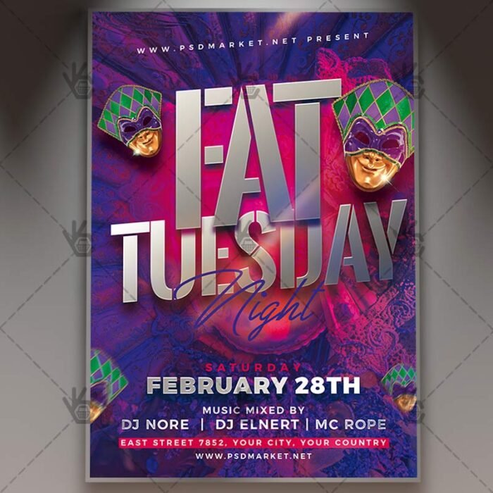 Fat Tuesday Night Flyer is a simply modern flyer design by PSDmarket Team to be used with Photoshop CS3 and higher. Save your time and use it for business or for your clients! This can be use for Fat Tuesday Night, Fat Tuesday, Fat Tuesday Party, Fat Tuesday Night Party, New Orleans Mardi Gras, Mardi Gras in the United States, Shrove Day, Mardi Gras, Mardi Gras Party, Mardi Gras Night, Carnival Party, Venetian Carnival Celebration, Mardi Gras Party Night, Mask Party and others.