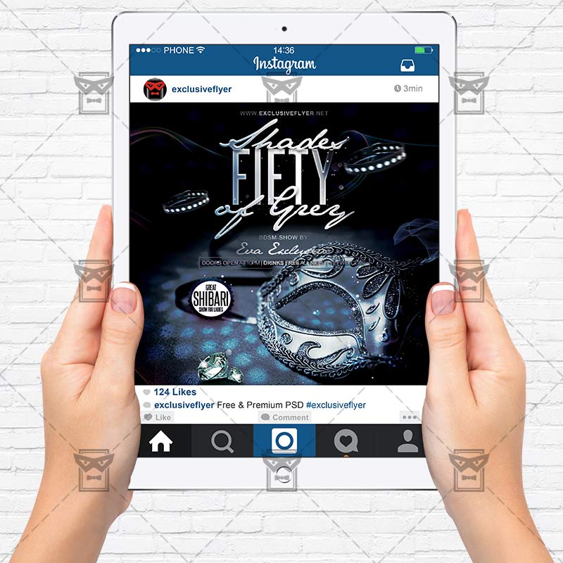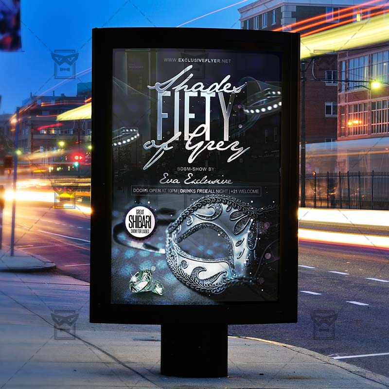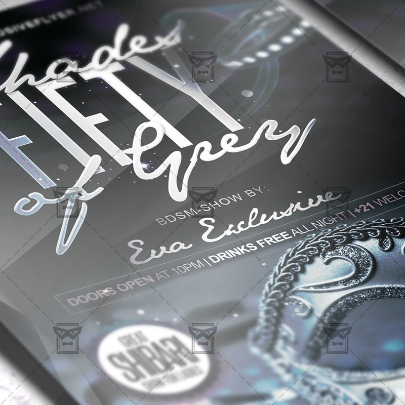 The Fifty Shades of Grey is the exclusive Photoshop PSD flyer template designed by ExclusiveFlyer to promote your Fifty Shades of Grey. This is a modern, stylish flyer and just be used for a Fifty Shades of Grey Live Show, Fifty Shades of Grey Night etc. Dear customers! – you can also: Customize any flyers or Hire Us to create any unique product. Also, you can get unlimited access to all our templates. You can buy 1 month membership, 3 or 6 months membership or even 1 year membership plan and login on site, choose a design, click the button DOWNLOAD TEMPLATE and it’s yours. No hassle, no checkout! When you paid the template, you can find it in your personal account and of course you’ve got a message to your e-mail (maybe in spam) with link to download. Also, you can find all templates, which you buy, in your personal account! All of our flyers have a very good quality (300DPI). And it means that you just need to download one of them and make the necessary modifications such as replace the elements or choose the colors and start to invite your guests! You can order from us design of Banner Ad, Bi-Fold Brochure, Tri-Fold Brochure, Business Card, Logo, One-Sided Flyer, Two-sided Flyer or Postcard. All you need is to checkout and write us all information on our e-mail or skype. (order now). There are a lot of free flyer templates, free business card templates on our site! Also there are a lot of categories of flyers such as club flyers, seasonal flyers, sport flyers and also business flyers. You have a great choise on our site, so good luck! Don’t forget to follow our Facebook community, our page on Twitter, on Pinterest and on Tumblr and leave comments, cause we work for you! PSD is set up in 1275×1875 dimension (4” x 6” with 0,25” bleed). The PSD file is very well organised, with color coded groups and layers named appropriately. Remember, all stock images of models and other people used only for demonstration all charms of the flyer and don’t included in the download!
