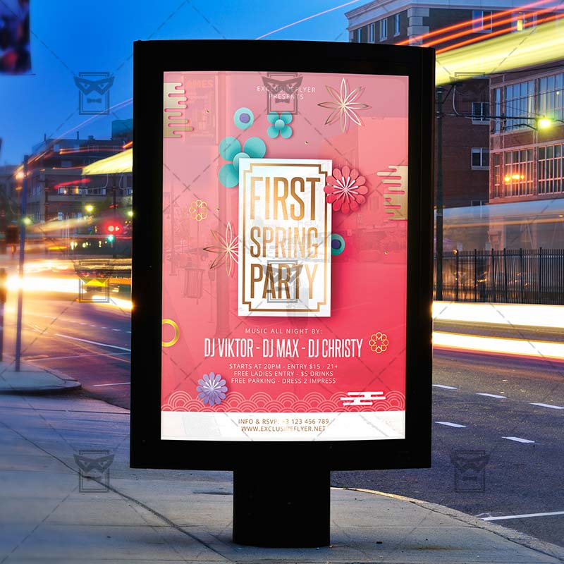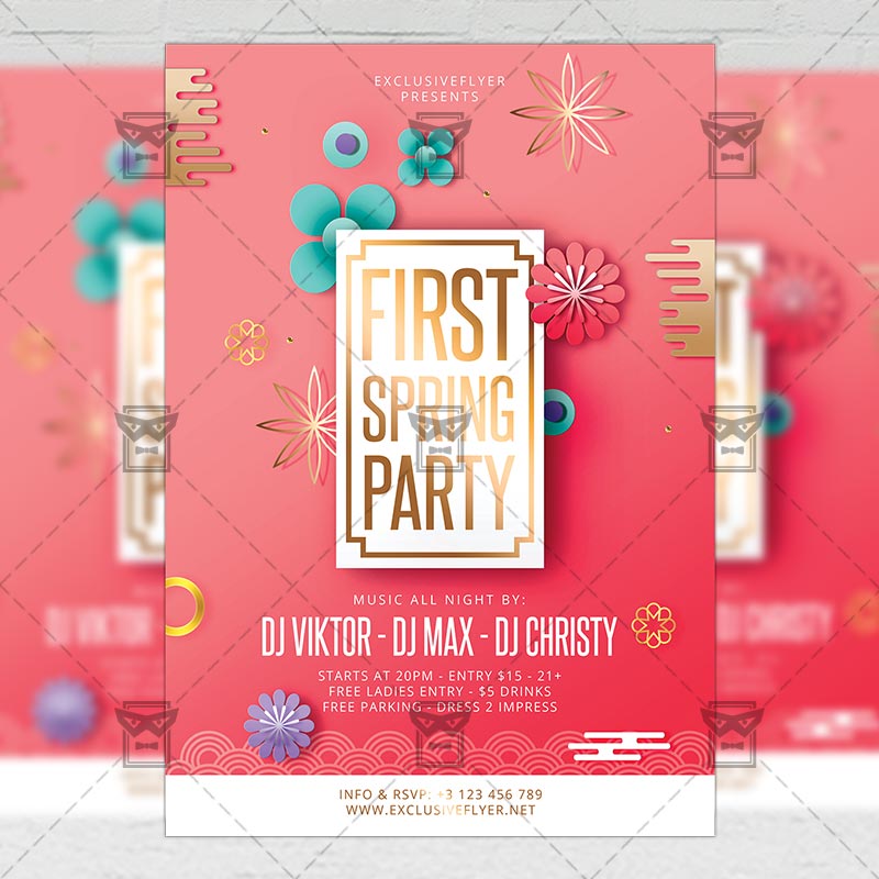 First Spring Party is an exclusive PSD flyer template for Adobe Photoshop designed by our best graphic designers to facilitate your task in promoting your business. With our readymade First Spring Party flyer in psd format you can invite you customers and guest to your event or to the best Spring Night, Spring Festival or Spring Party in their lives.