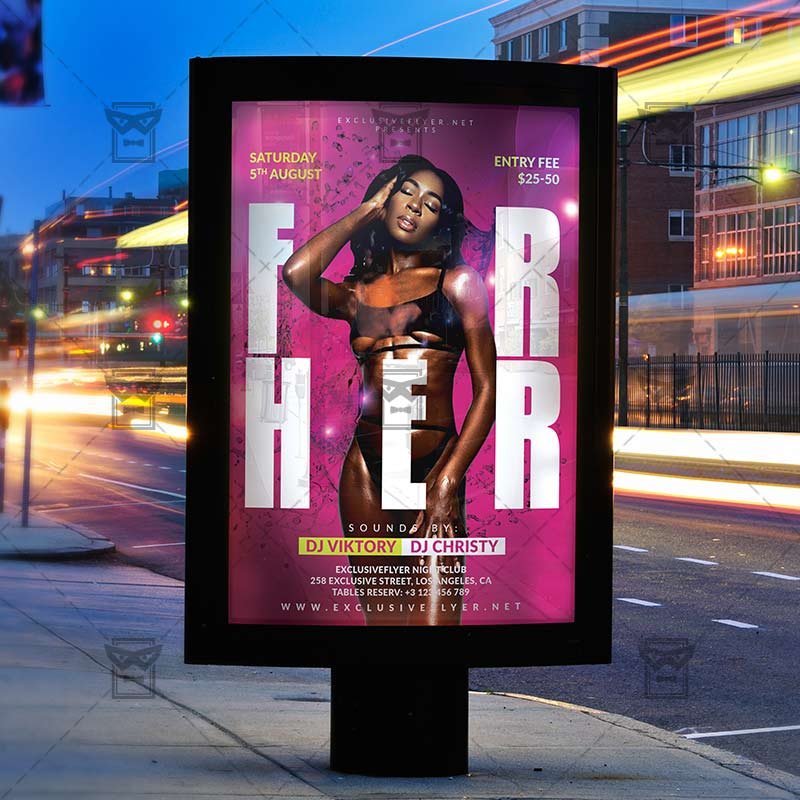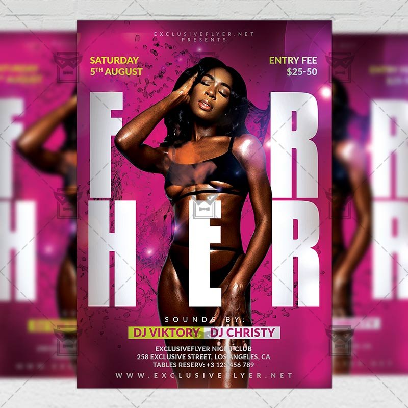 For Her Night an exclusive PSD flyer template for Adobe Photoshop designed by our best graphic designers to facilitate your task in promoting your business. With our readymade Club flyer in psd format you can invite you customers and guest to your event or to the best Ladies Night, Girls Night Out, Ladies Night Out Party or Hen Party in their lives.