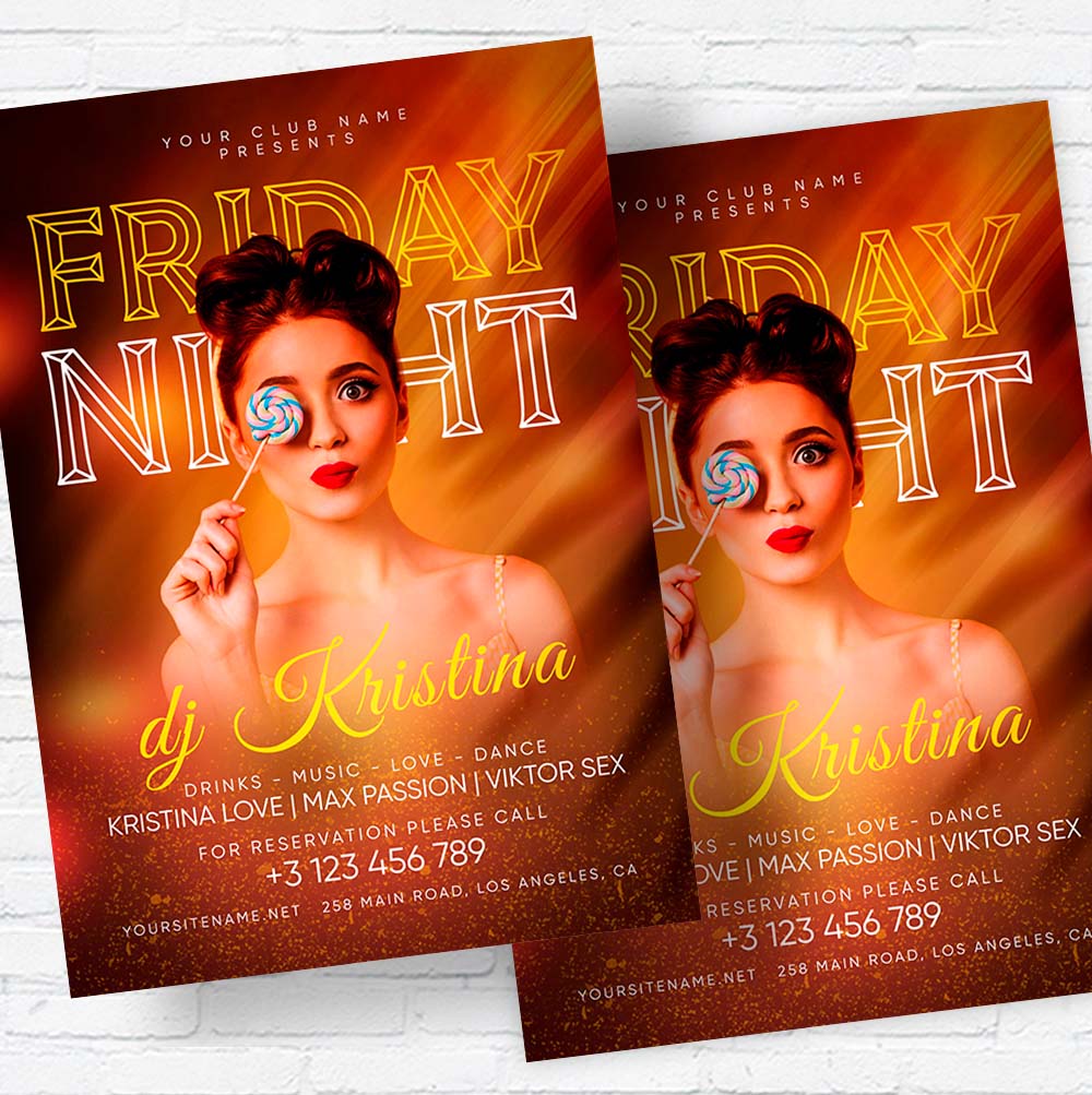Friday Night is an exclusive PSD flyer template for Adobe Photoshop designed by our best graphic designers to facilitate your task in promoting your business. This psd poster/flyer is the best choice for Club Party, Dj Night, Dj Party, Club Bash, Dj Bash, Music Night, Music Party, Club Vibes, and Club Sounds. With our readymade Friday Night PSD Template flyer in psd format, you can invite your customers and guests to your event with a minimum of effort and time.