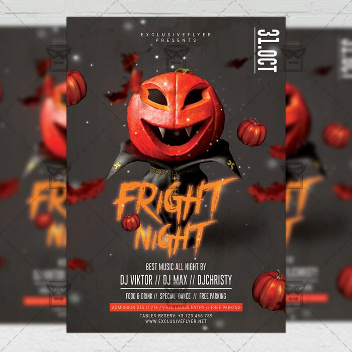 Fright Night an exclusive PSD flyer template for Adobe Photoshop designed by our best graphic designers to facilitate your task in promoting your business. With our readymade Club flyer in psd format you can invite you customers and guest to your event or to the best Spooky Night, Halloween Night, Beautiful Nightmare, Scary Night Party or Halloween Affair in their lives.