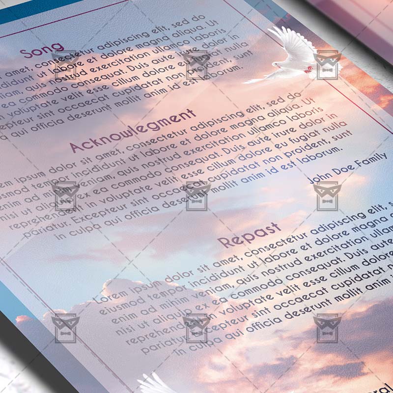 Funeral Obituary Template an exclusive PSD flyer template for Adobe Photoshop designed by our best graphic designers to facilitate your task in promoting your business. With our readymade Club flyer in psd format you can invite you customers and guest to your event or to the best Funeral Program, Pbituary Program, Funeral Obituary, Celebration of Life, In Loving Memory Program in their lives.