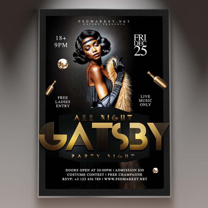 Make your event unforgettable with the Gatsby Club Flyer Template. Download it today from PSD Market and start promoting your high-class event in style!