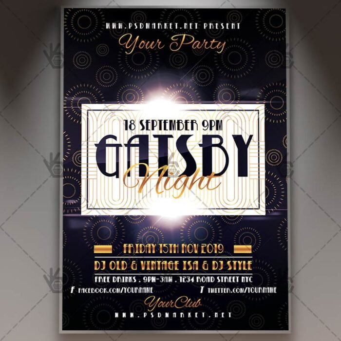 Gatsby Night Flyer is a simply modern flyer design by PSDmarket Team to be used with Photoshop CS3 and higher. Save your time and use it for business or for your clients! This can be use for Gatsby Night, Gatsby Party, Gatsby Fest, Gatsby Dance Party, Retro Gatsby Party, Gatsby Nights, Gatsby Party Night and others.
