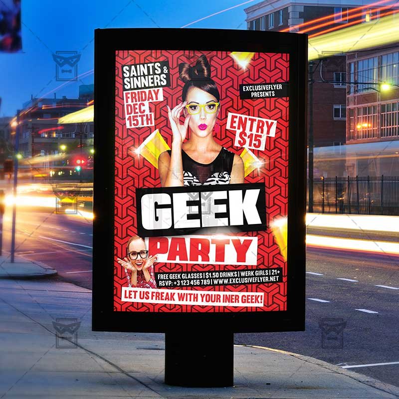 Geek Party is an exclusive PSD flyer template for Adobe Photoshop designed by our best graphic designers to facilitate your task in promoting your business. With our readymade Geek Party flyer in psd format you can invite you customers and guest to your event or to the best Geeks Night or Freaks Party in their lives.