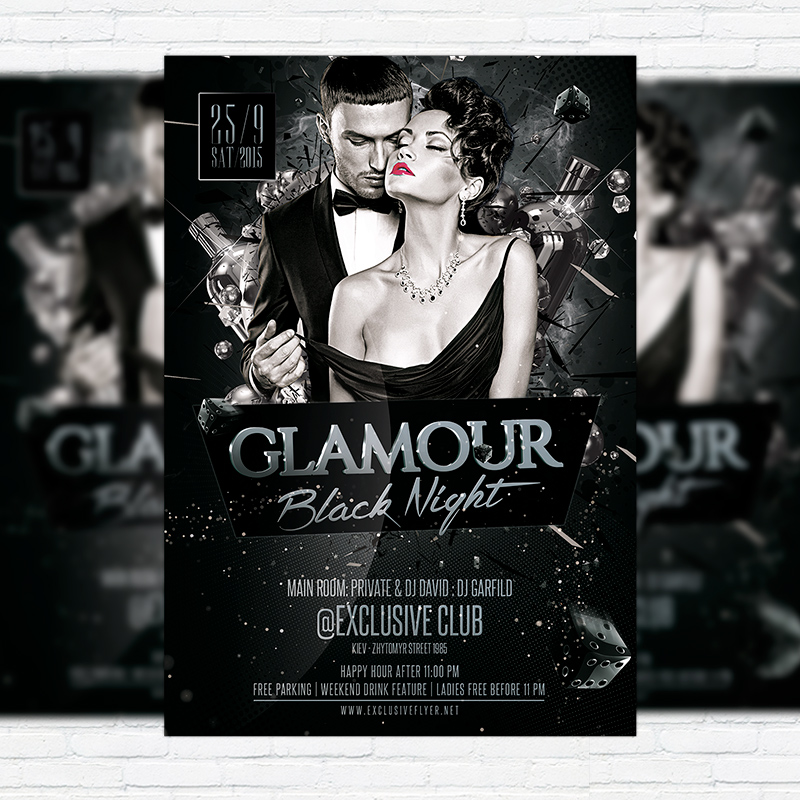The Glamour Black Night is the exclusive Photoshop PSD flyer template designed by ExclusiveFlyer to promote your Glamour Black Night Party. This is a modern, stylish, black flyer and just be used for a VIP Party or Exclusive Night or Birthday Party etc. Dear customers! – you can also: Customize any flyers or Hire Us to create any unique product. Also, you can get unlimited access to all our templates. You can buy 1 month membership, 3 or 6 months membership or even 1 year membership plan and login on site, choose a design, click the button DOWNLOAD TEMPLATE and it’s yours. No hassle, no checkout! When you paid the template, you can find it in your personal account and of course you’ve got a message to your e-mail (maybe in spam) with link to download. Also, you can find all templates, which you buy, in your personal account! All of our flyers have a very good quality (300DPI). And it means that you just need to download one of them and make the necessary modifications such as replace the elements or choose the colors and start to invite your guests! You can order from us design of Banner Ad, Bi-Fold Brochure, Tri-Fold Brochure, Business Card, Logo, One-Sided Flyer, Two-sided Flyer or Postcard. All you need is to checkout and write us all information on our e-mail or skype. (order now). There are a lot of free flyer templates, free business card templates on our site! Also there are a lot of categories of flyers such as club flyers, seasonal flyers, sport flyers and also business flyers. You have a great choise on our site, so good luck! Don’t forget to follow our Facebook community, our page on Twitter, on Pinterest and on Tumblr and leave comments, cause we work for you! PSD is set up in 1275×1875 dimension (4″×6″ with 0,25″ bleed). The PSD file is very well organised, with color coded groups and layers named appropriately. Remember, all stock images of models and other people used only for demonstration all charms of the flyer and don’t included in the download!