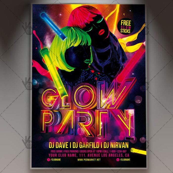 Glow Party is a simply modern flyer design by PSDmarket Team to be used with Photoshop CS3 and higher. Save your time and use it for business or for your clients! This can be use for Glow Night, Glow Fest, Paint Party, Neon Party, Teen Party, Laser Night and others.